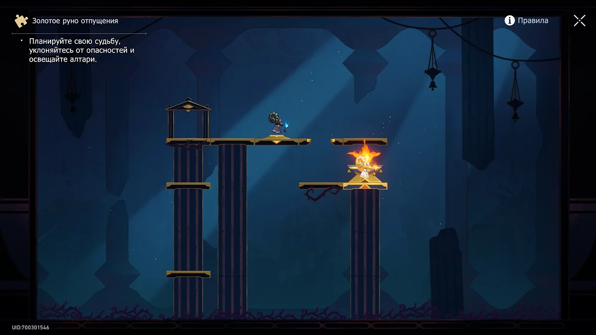 Щоб розв'язати загадку, вам потрібно запалити вогнище і не впасти в Безодню. Для цього, керуючи істотою з козячою головою, пройдіть до кінця дороги, після чого зробіть крок назад і стрибніть вниз. Потім просто підійдіть до вогнища, і воно загориться. Після цього натисніть «Отримати скарб».