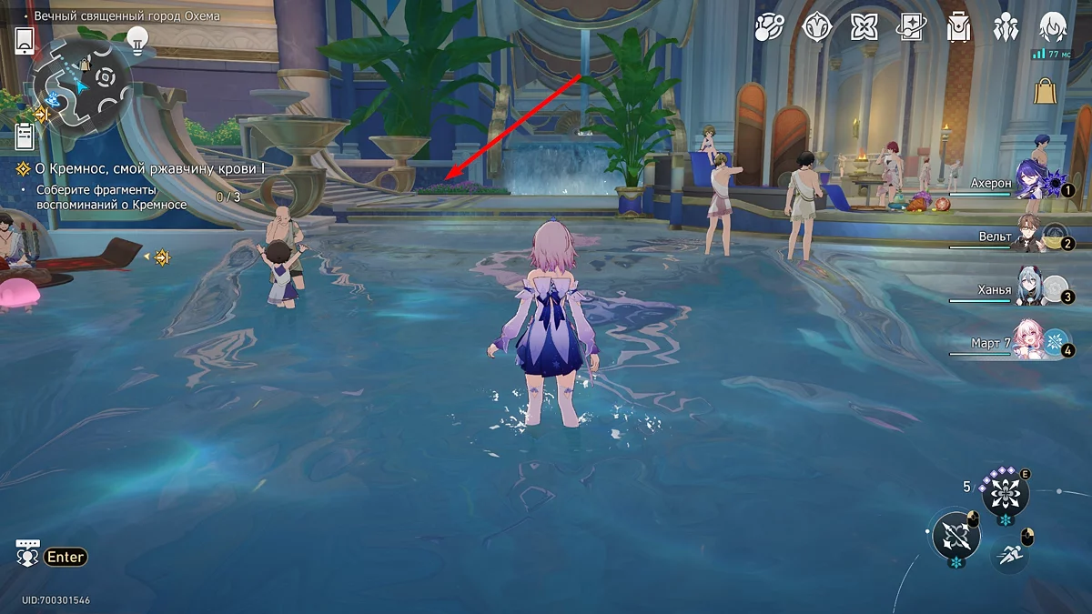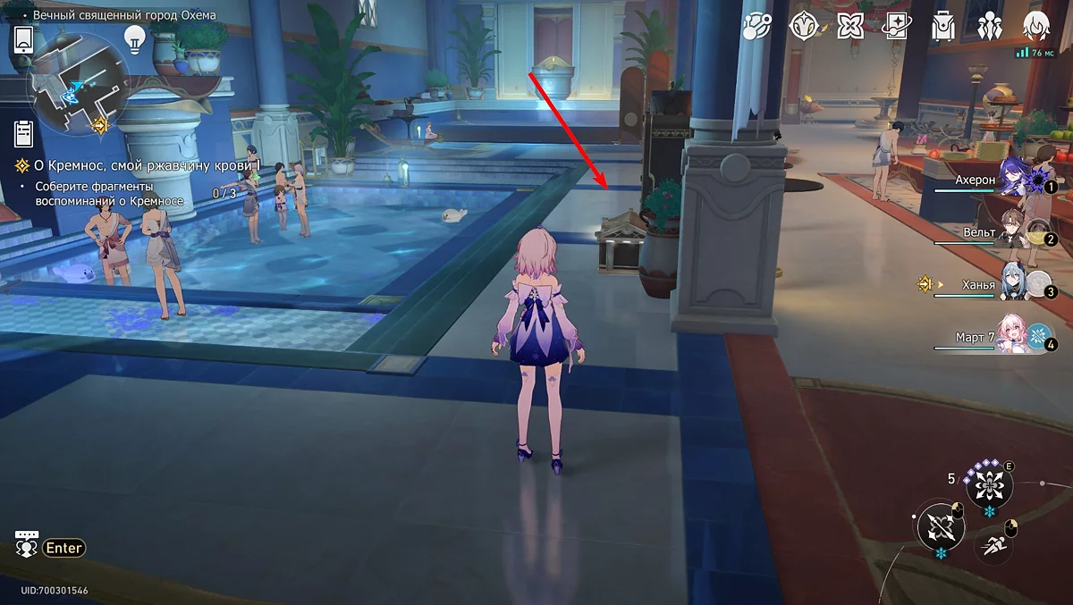 Пройдіть коридором до просторового якоря, або відразу скористайтеся телепортом у Дворі трьох сезонів і зверніть у купальні. Біля стіни біля одного з басейнів буде шукане скарбничка.