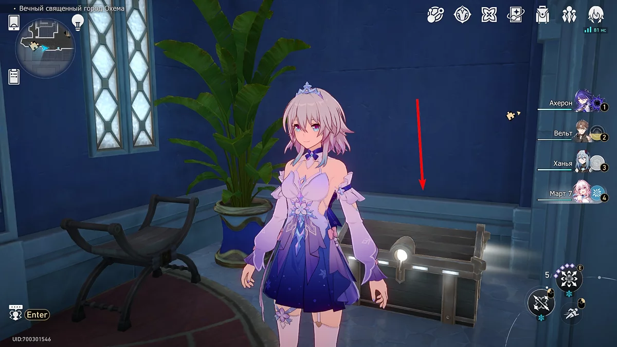 Від того ж телепорта заверніть наліво і спустіться в ще одну кімнату, де місцеві жителі слухають історії. В кутку приміщення побачите дев'яту за рахунком звичайну скриню, що стоїть поруч з колонною.