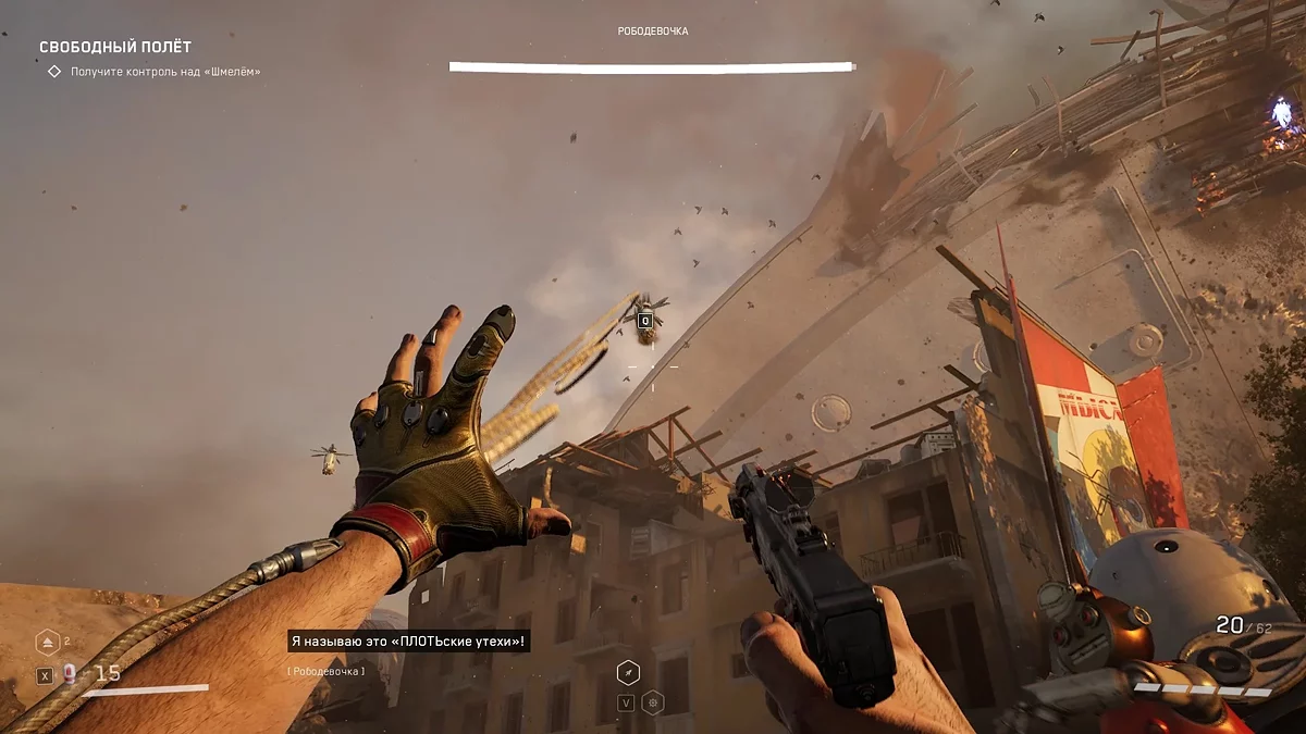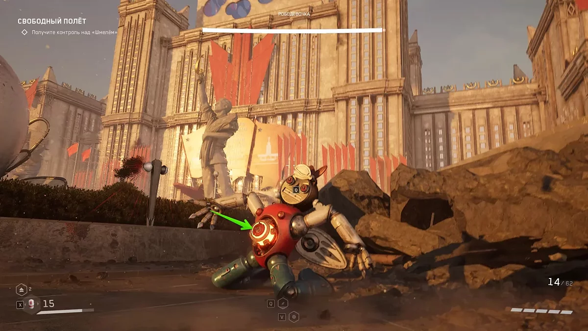 Підійдіть до Шмеля і взаємодійте з отвором у його корпусі, попередньо підготувавшись до нападу роботів. Всього буде кілька хвиль, після яких вам потрібно намагатися підключитися до нього. На третій раз майору все ж вдасться це зробити, і ви опинитеся на іншій локації.