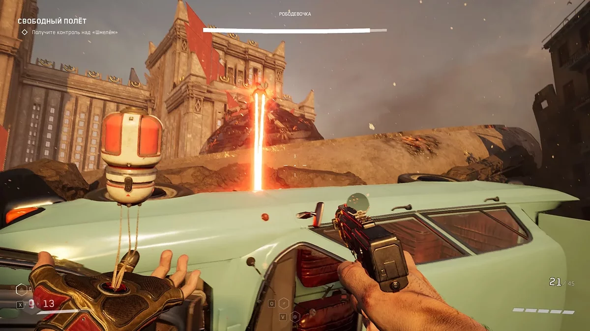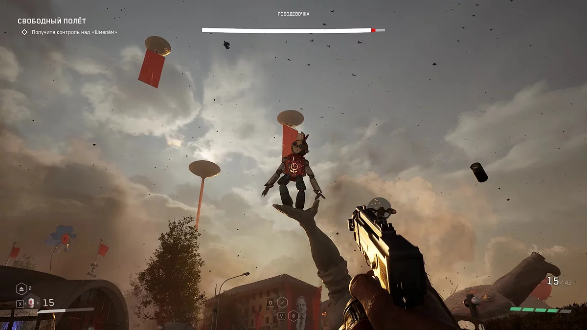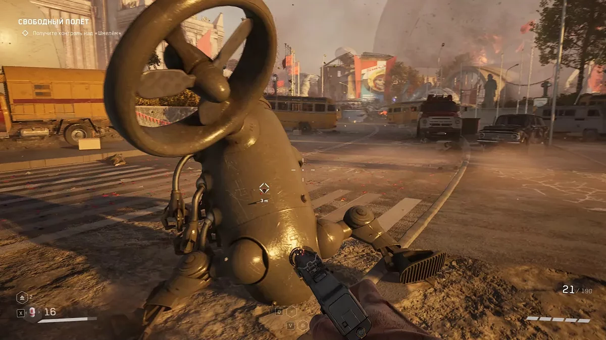 Продовжуйте ухилятися від атак і наносити шкоду з вогнепальної зброї. Коли у супротивника не залишиться здоров'я, дивіться тривалий відеоролик, що завершує сюжетне доповнення для Atomic Heart.