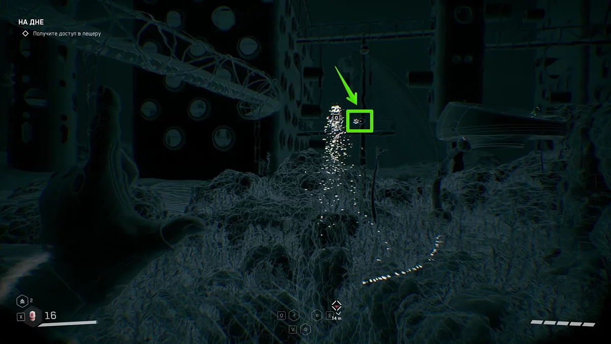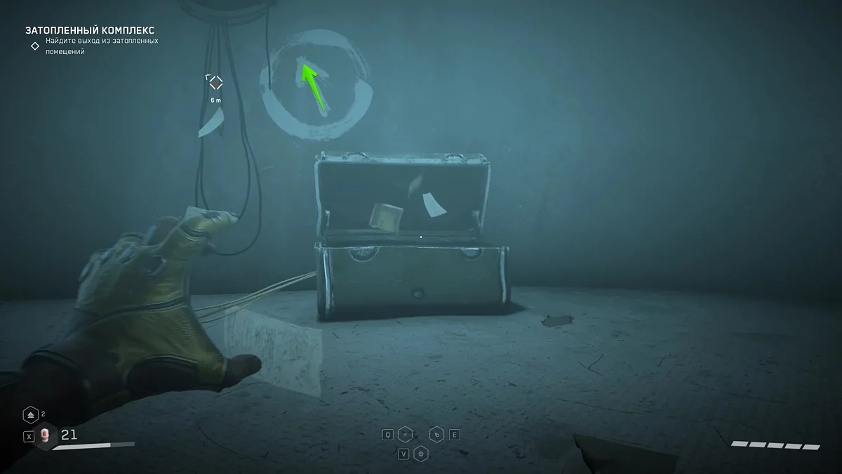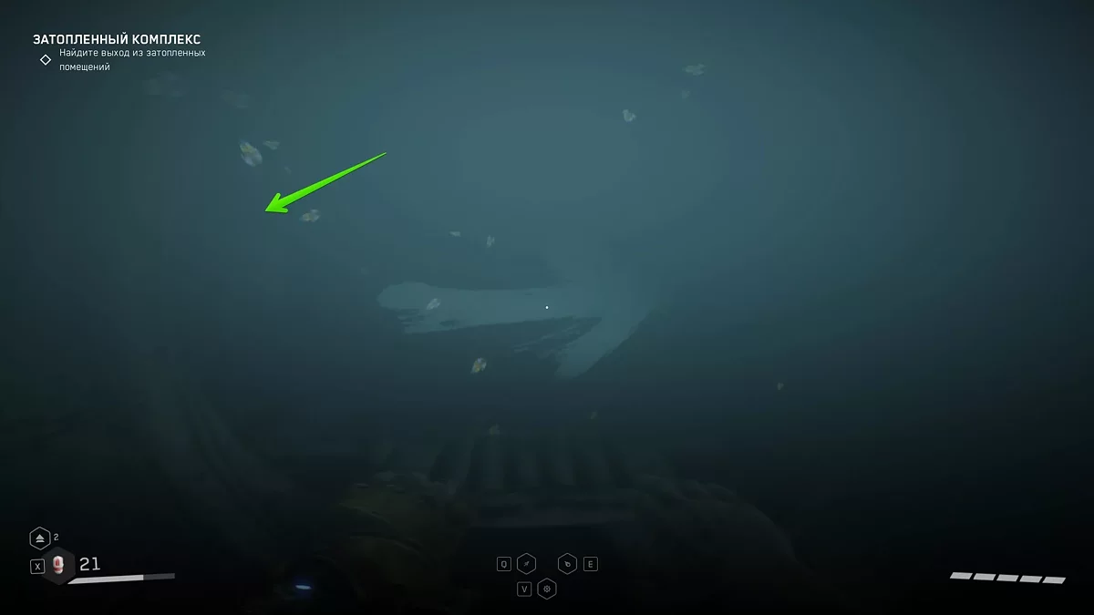 Пірнайте під воду, але не пливіть за маркером. Знайдіть сходи, що ведуть нагору з протилежного боку, тут є скриня з припасами. Коли зробите це, пливіть за маркером. Так ви опинитеся в депо.