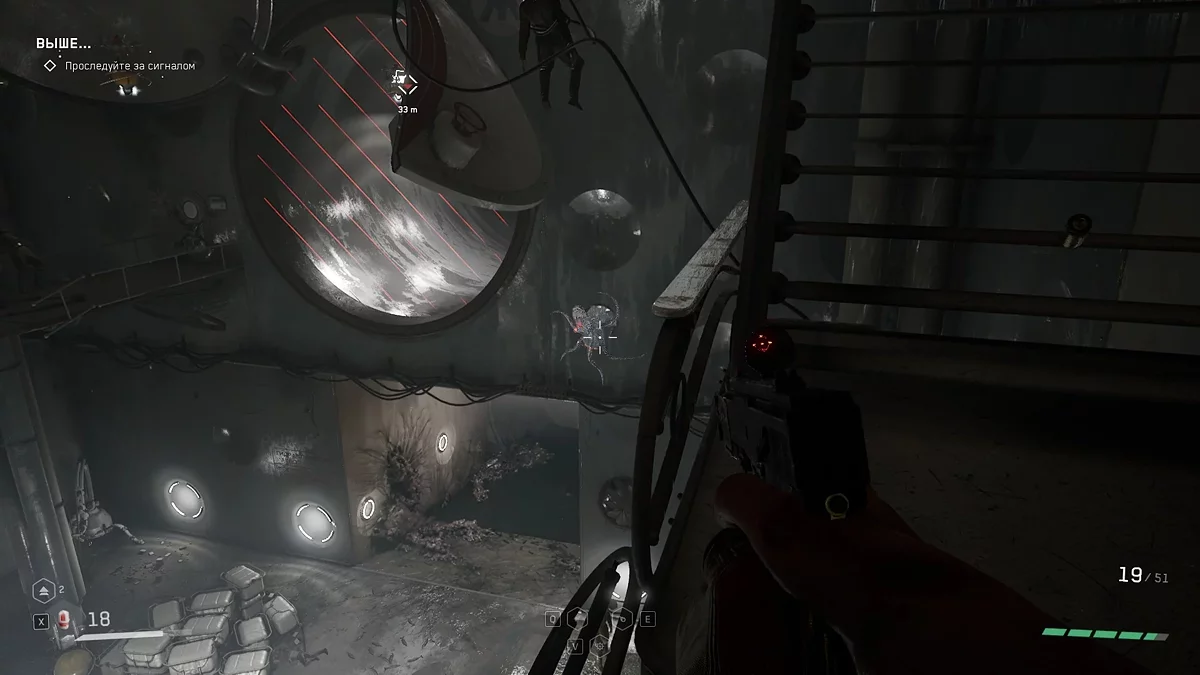 Як тільки опинитеся на вершині конструкції, почнеться діалог героїв, який не можна пропустити. Вислухайте Блесну і огляньте скриню на цій платформі, після чого знайдіть сходи нагору — тут ще один ящик з поліпшенням для дробовика (горизонтальний ствол).