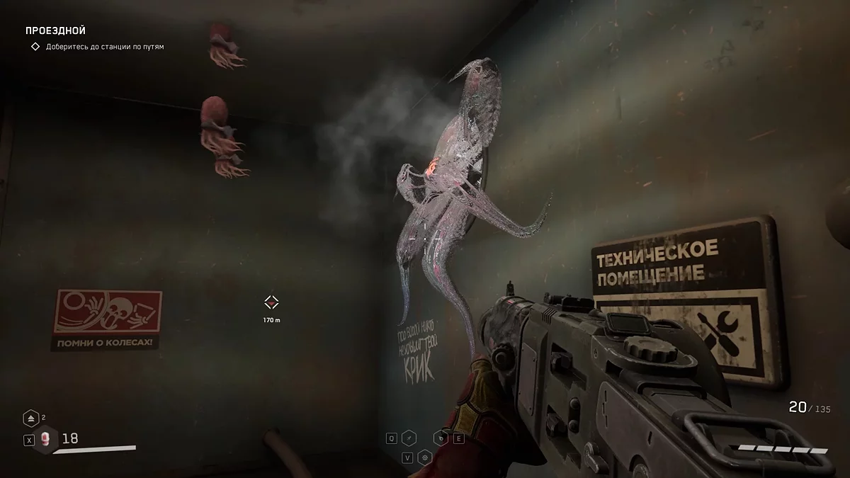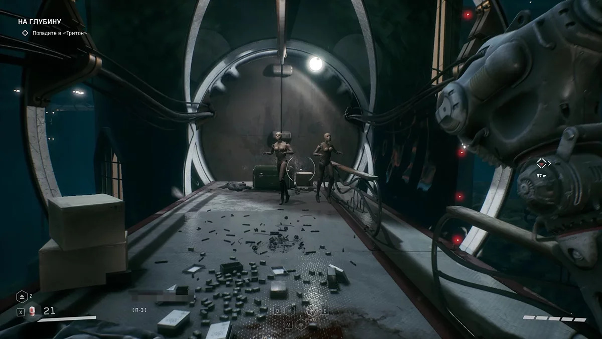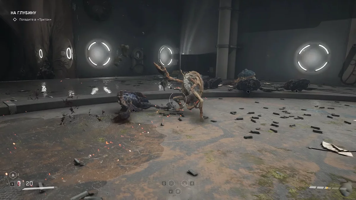 У сусідньому приміщенні також є ящик з припасами, а також кімната відпочинку. Коли будете готові, слідуйте в єдину відкриту залу. Так ви познайомитеся з черговим новим типом монстрів — крабами. Їх панцир досить міцний, немає сенсу стріляти по ньому або використовувати зброю ближнього бою. Дочекайтеся, коли ворог відкриє вразливе місце, потім стріляйте по черевцю. Також монстри непогано гинуть від вибуху нової здібності Нечаєва.