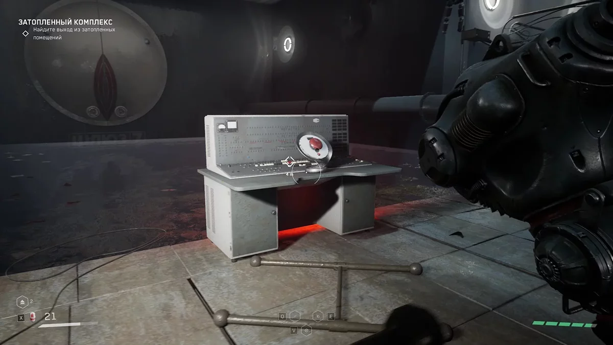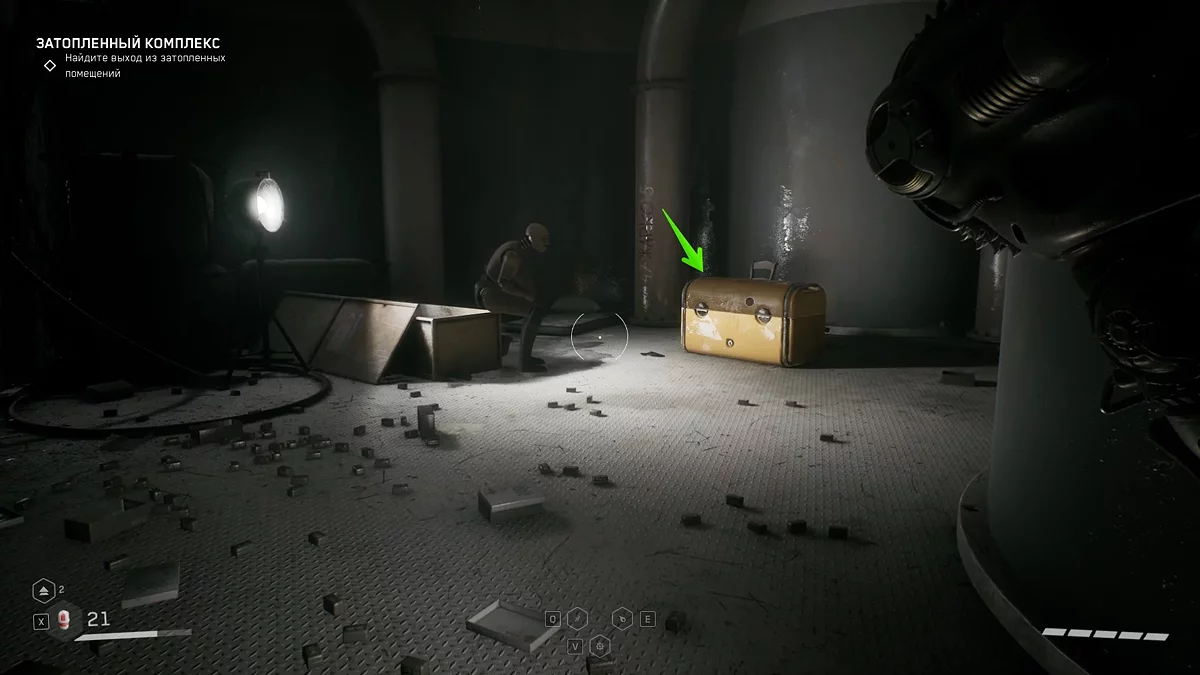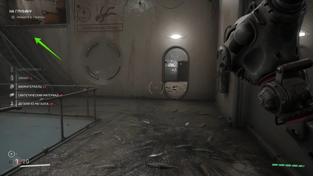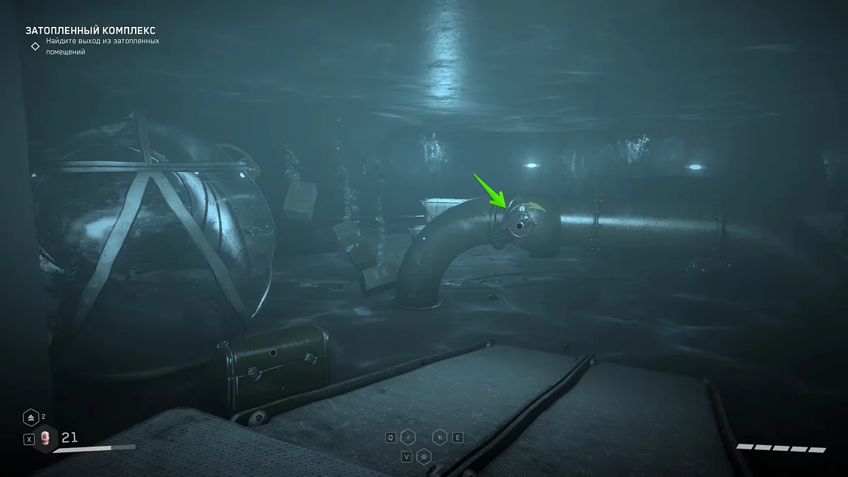 Після бесіди з бабою Зіною стрибайте в єдиний відкритий люк, що веде в затоплені частини комплексу, і пропливайте по вентиляції. У машинному залі заберіть вміст кількох ящиків і натисніть на червону кнопку біля воріт. Завдання оновиться.