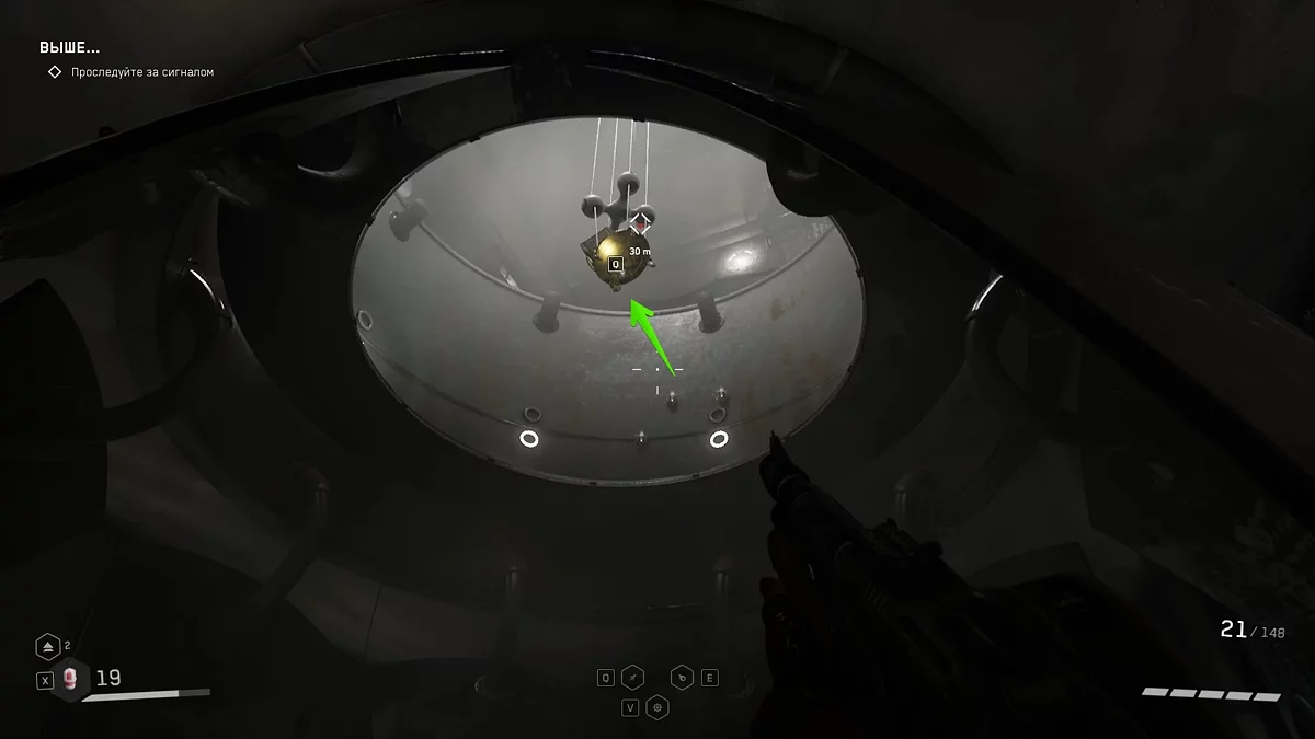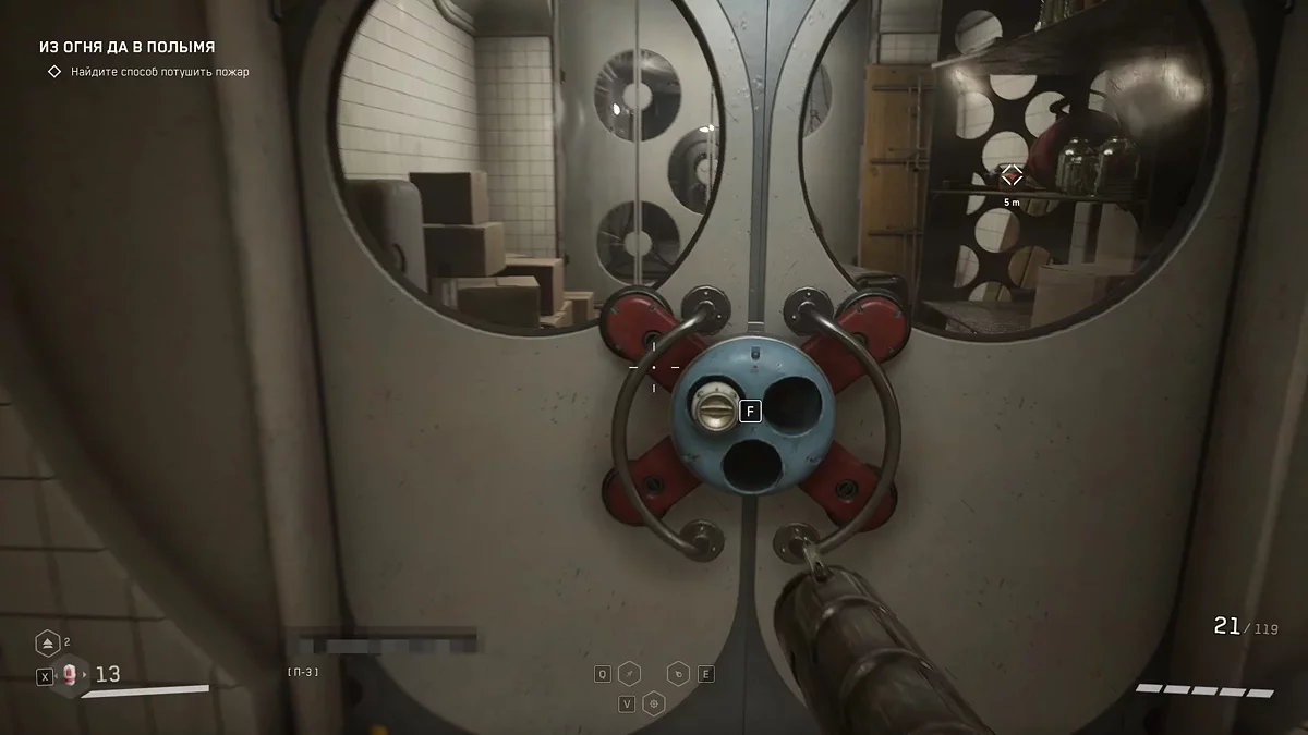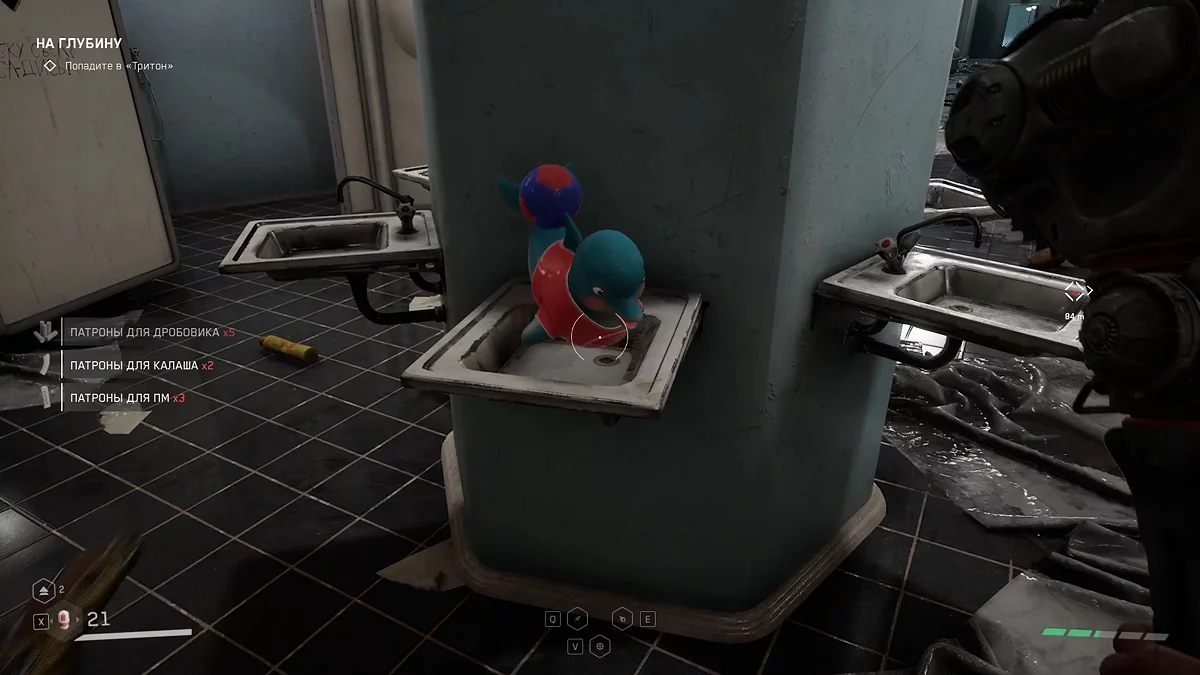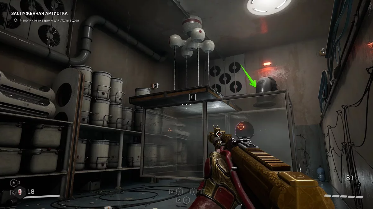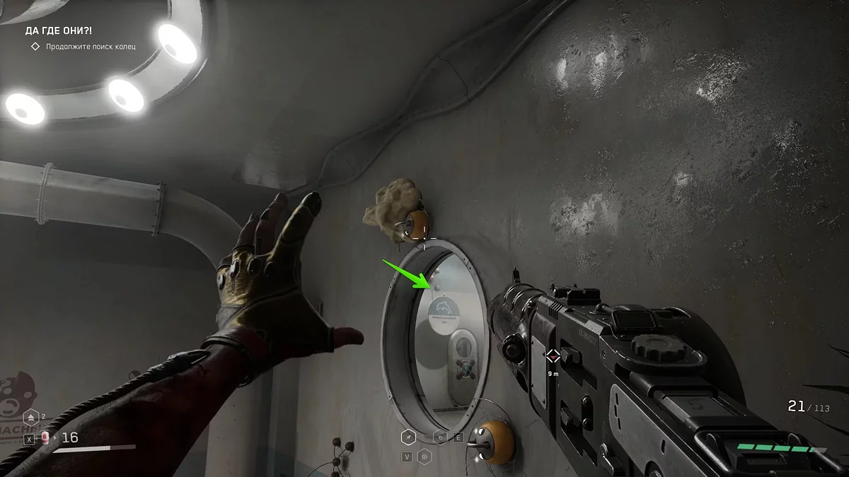 Після бесіди з бабою Зіною стрибайте в єдиний відкритий люк, що веде в затоплені частини комплексу, і пропливайте по вентиляції. У машинному залі заберіть вміст кількох ящиків і натисніть на червону кнопку біля воріт. Завдання оновиться.