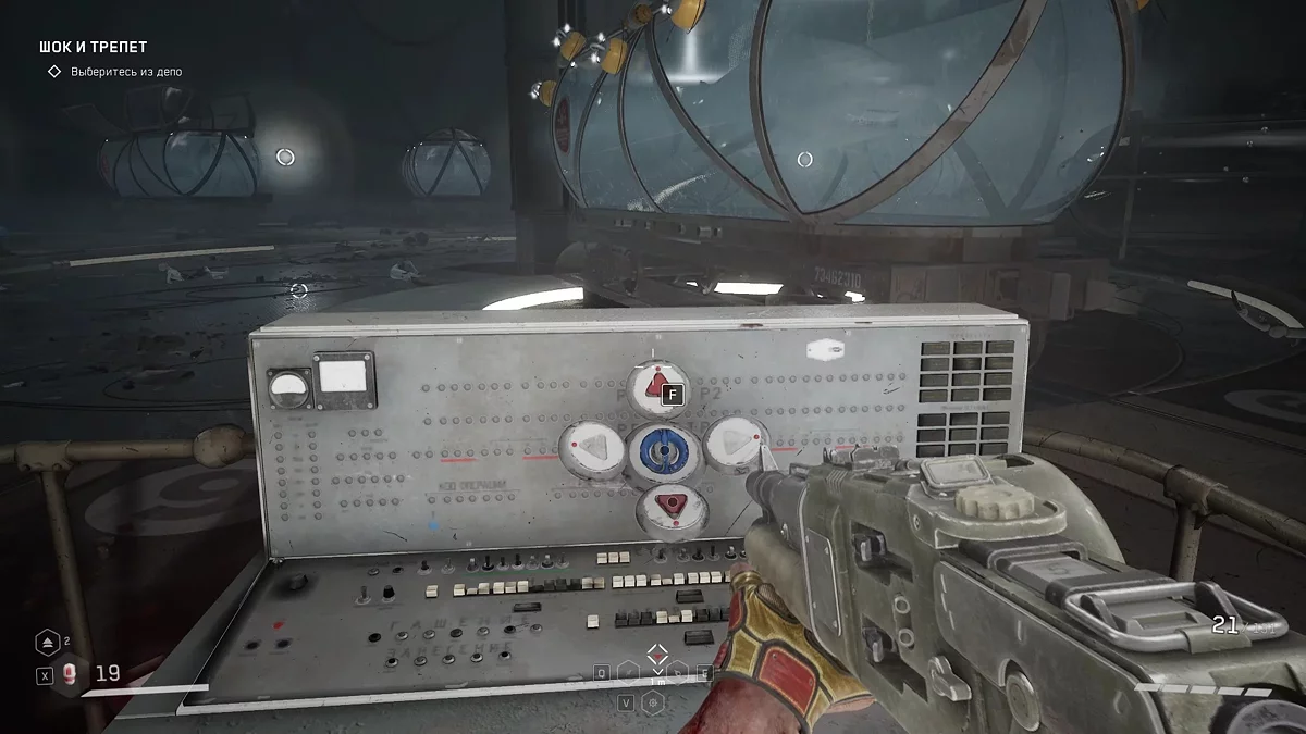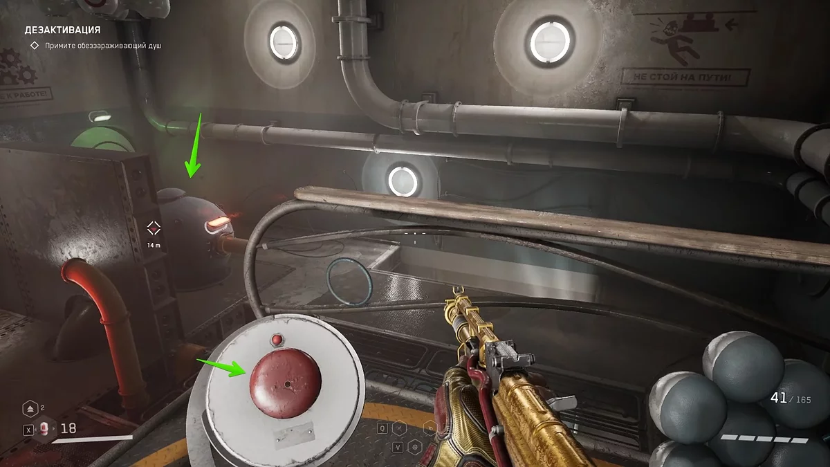 Добравшись до чергових замкнених дверей, подивіться вгору і скористайтеся гаком. За допомогою вентиля перемістіть цистерну вправо, потім знайдіть кнопку на балконі і натисніть її. Дочекайтеся, поки прибуде заповнена цистерна, і поверніться до душової, щоб пройти дезінфекцію. Попередньо не забудьте спуститися вниз під платформу і знайти захований ящик з припасами.