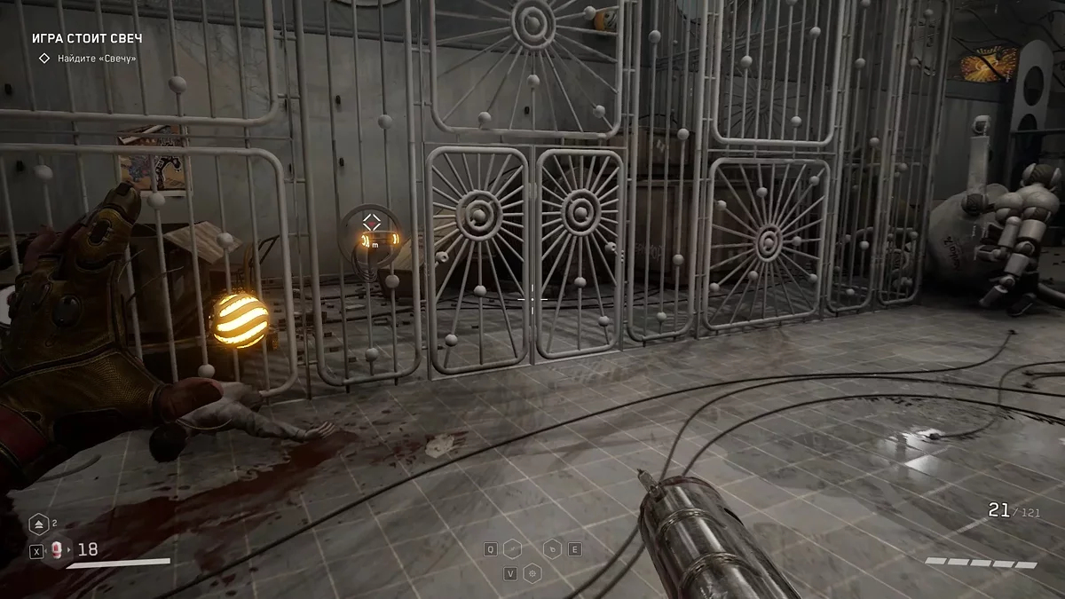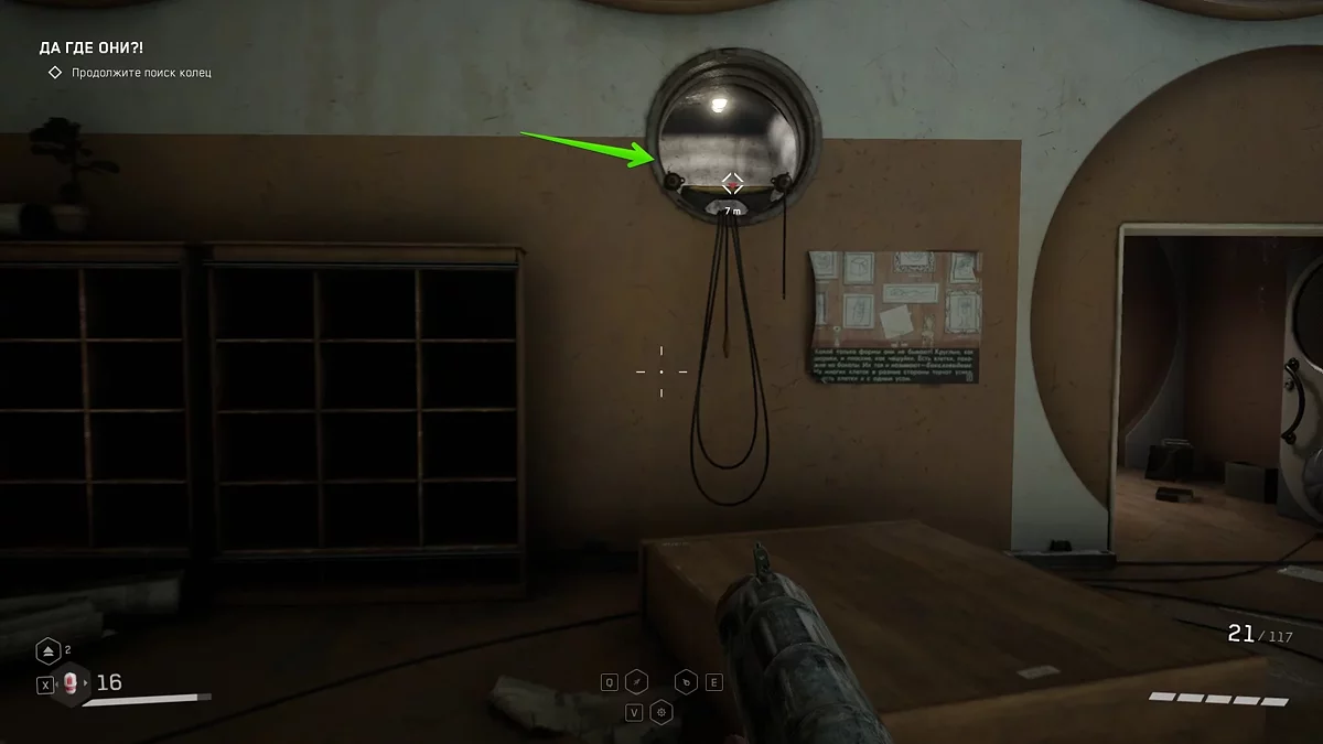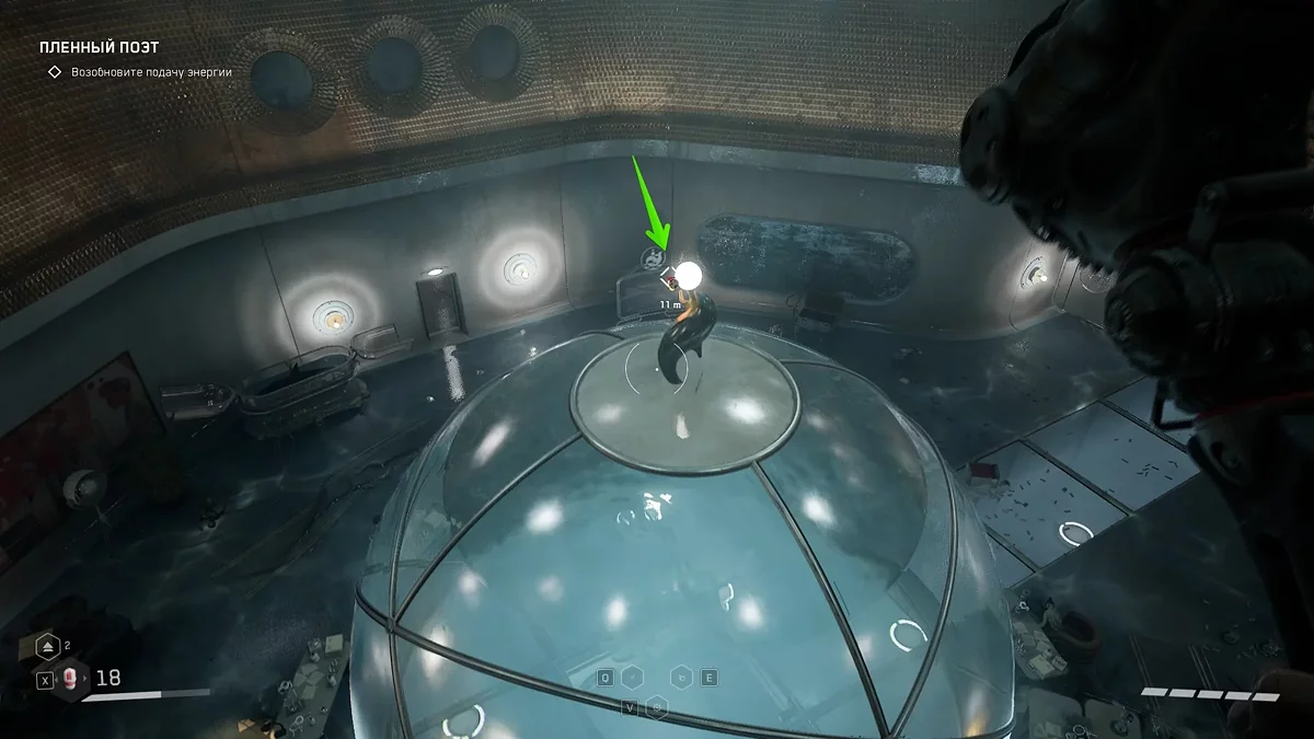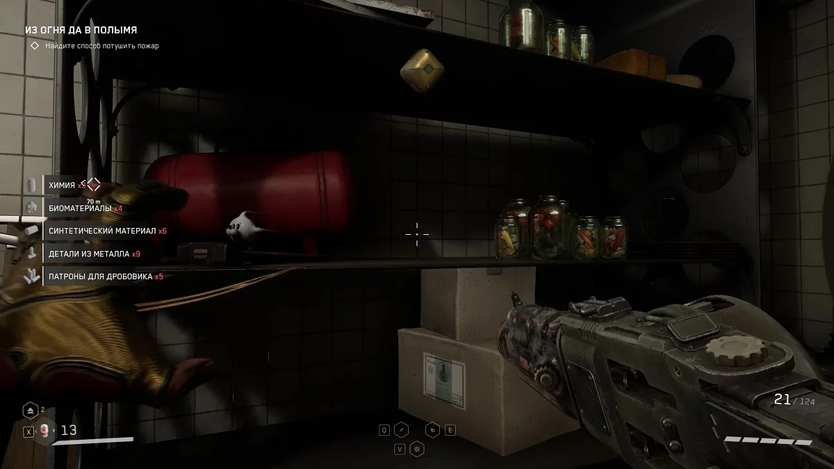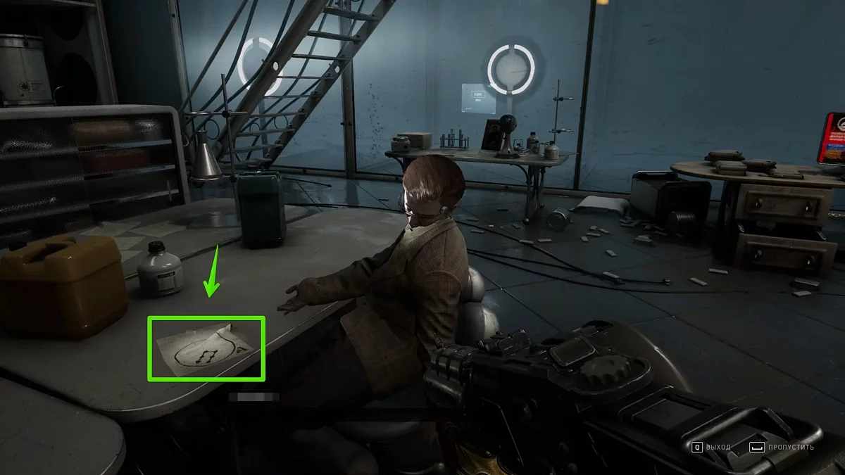 Позбавтеся від роботів і підійдіть до пролому в стіні, за яким видніється труба. Використайте гак, потім киньте фаєр через стіну, щоб підпалити газ. За відкритими дверима можете підібрати припаси та щебетар «Дело Чичикова» на столі. Заберіть енергетичний елемент і вставте його в пристрій поруч із кнопкою для відкриття решітки.