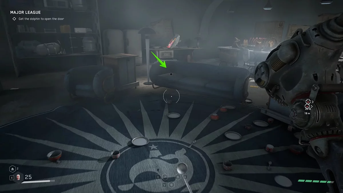 Як тільки управління перейде до вас, на дивані підберіть щебетар «Пристрасть». Візьміть з ящика один з червоних м'ячиків. За допомогою цього предмета потрібно провести дельфіна до дверей, щоб він їх відкрив. Спершу приведіть дельфіна до акваріума без води, покладіть м'яч на землю і взаємодійте з вентилем.