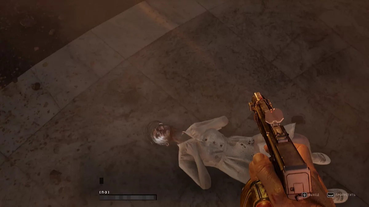 Біля сходів перед будівлею лежить мертвець депутат — можете поспілкуватися з ним для колекції. Також огляньте столик за автомобілем з лівого боку локації, де лежить щебетар «Персі Бісі Шелл». Більше на цій карті нічого немає, можете підійти до воріт і скористатися батогом (клавіша Q), щоб перебратися через вогонь.