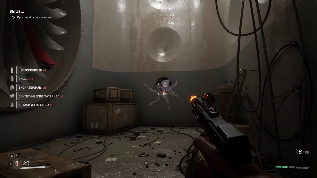 Далі в кімнаті ви помітите восьминога, що залазить у вентиляційну шахту. Не поспішайте слідувати за ним — спочатку обшукайте приміщення і знайдіть кілька ящиків, а також комп'ютер з записями. Коли будете готові, зірвіть решітку з вентиляції і залазьте всередину.