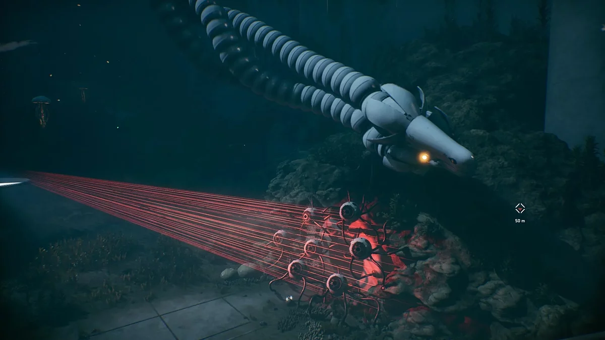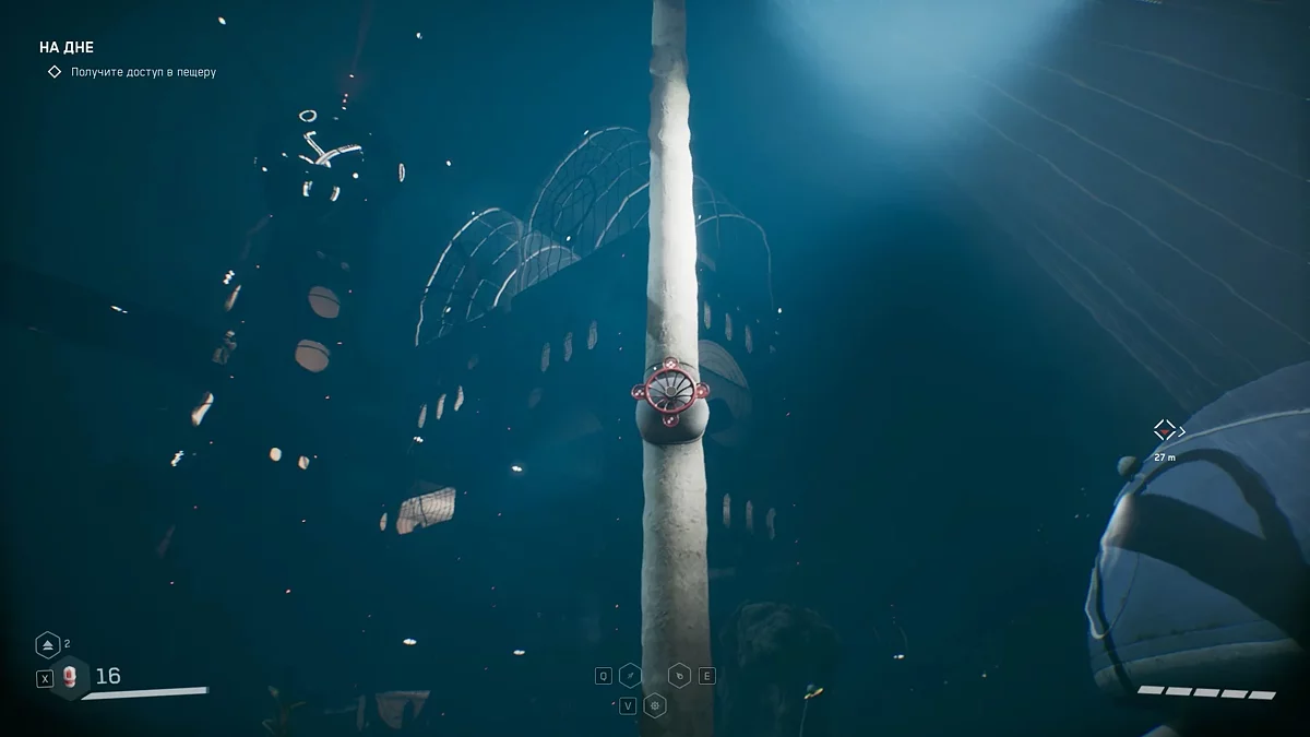 Опинившись на дні озера, ви побачите невелику катсцену, по закінченні якої стане зрозуміло, що герою варто уникати світла прожекторів. Використовуйте медуз та інші об'єкти, щоб підтягуватися батогом і пересуватися швидше під водою.