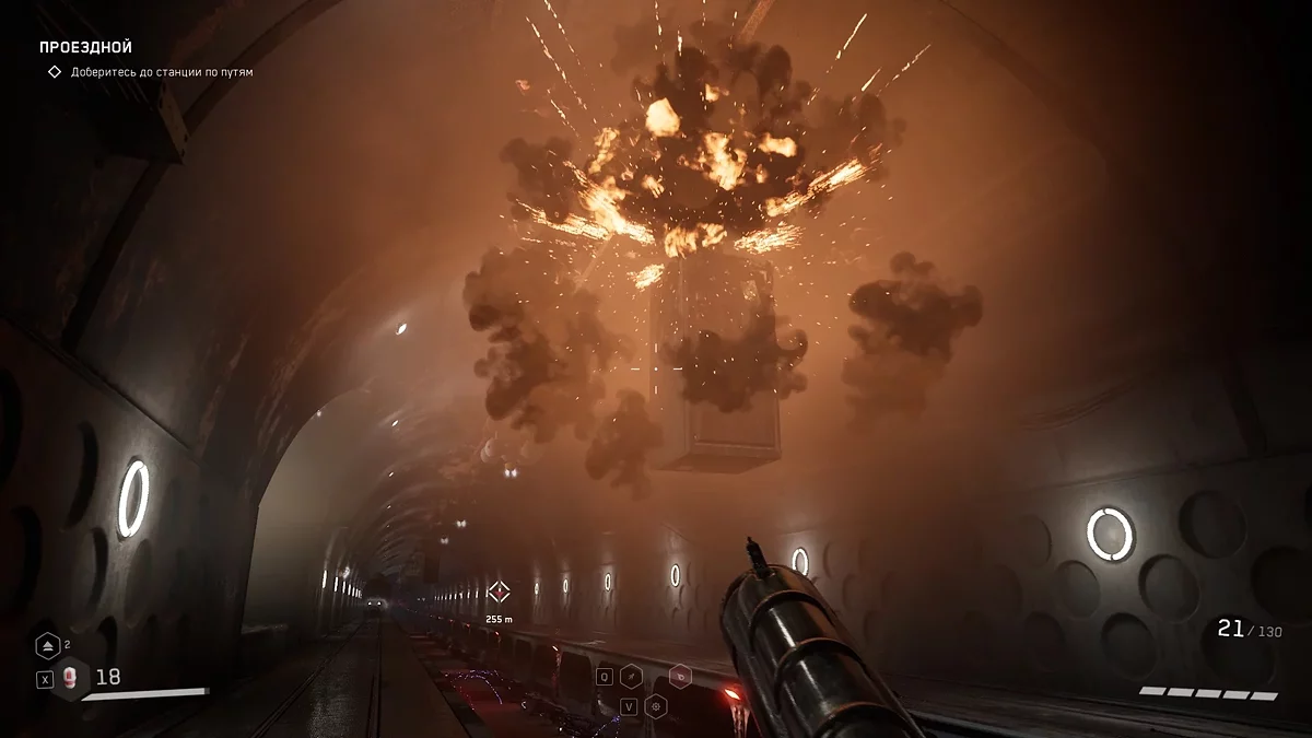 Перед вами залізничний перегін, більше схожий на тунелі метро. Рухатися можна тільки по шляхах, де з тимчасовим інтервалом проходять склади. Між ними підлога наелектризована, так що спускатися не радимо — вже на середньому рівні складності герой загине за одне миттєвість.