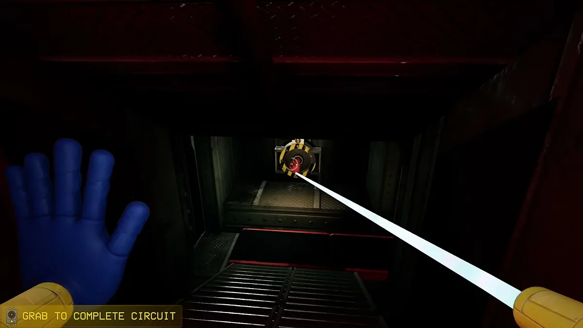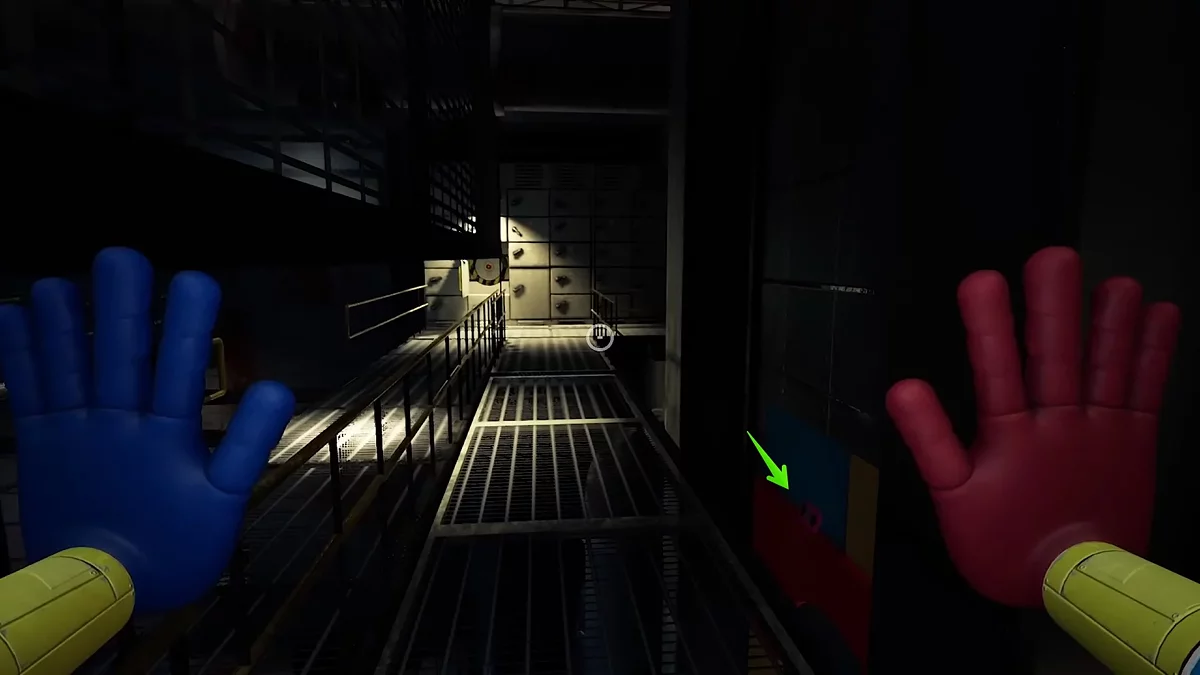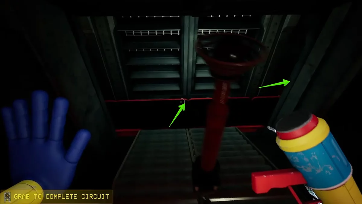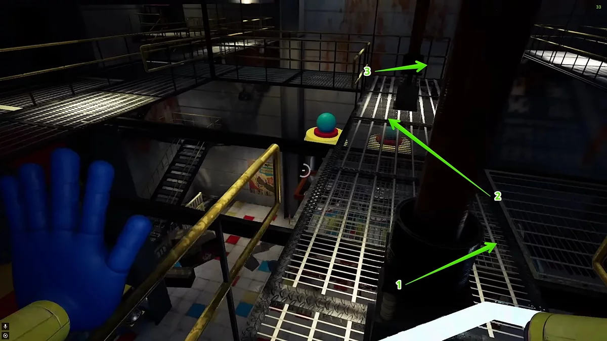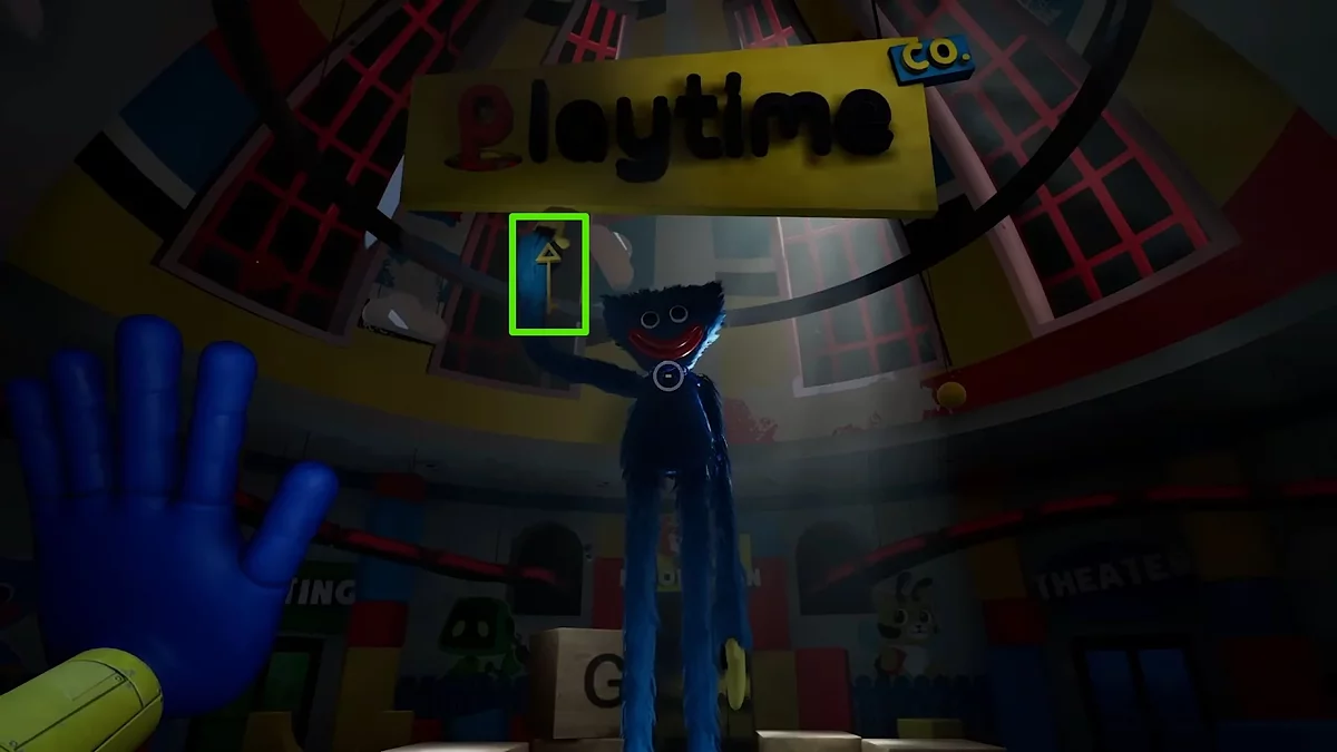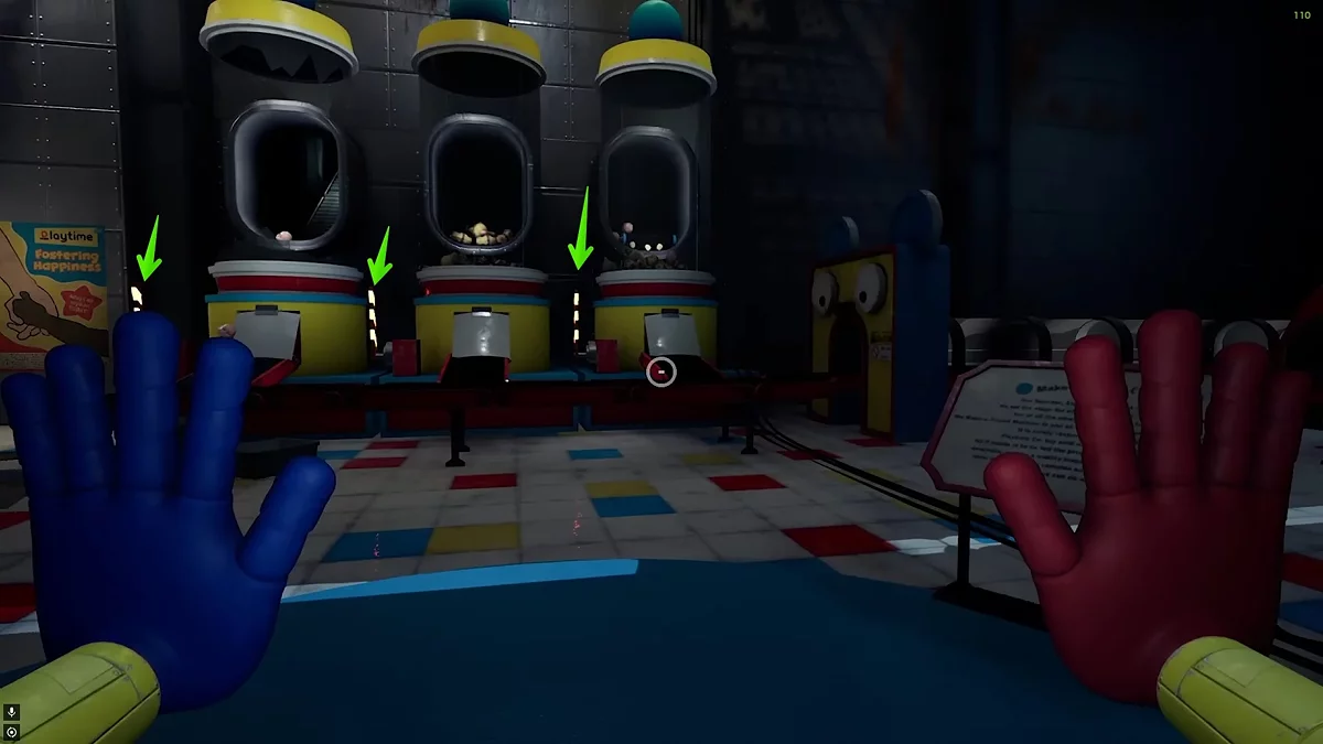 Зробивши це, спустіться вниз і взаємодійте з трьома важелями та дочекайтеся, поки машини зберуть іграшку. Заберіть її на виході і вставте в пристрій біля замкнених дверей. Коли ви спробуєте пройти вперед, з’явиться гігантська іграшка. Біжіть у зворотний бік і заходьте в відкритий прохід в кінці конвеєра.