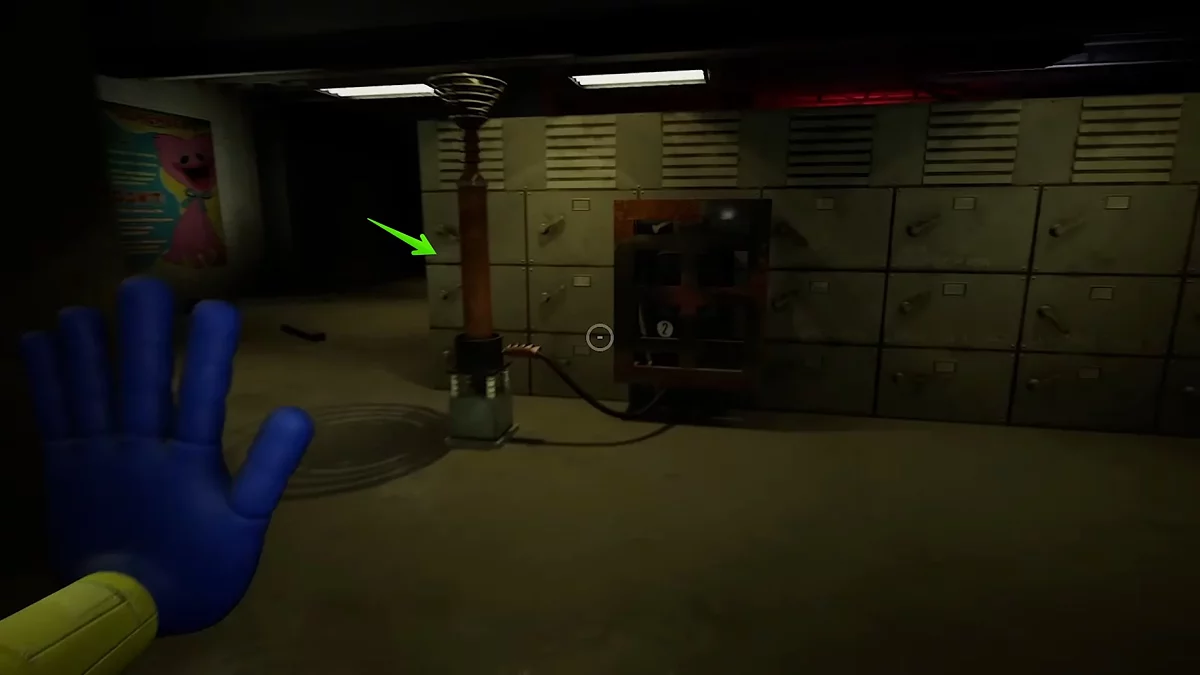 Слідуйте вперед по конвеєру, поки не опинитесь у кімнаті для виробництва іграшок. Щоб активувати механізми, необхідно спочатку подати електрику. Для цього підніміться по металевій драбині і підтягніть до себе платформу. Справа на стіні ви побачите рожеву відеокасету.