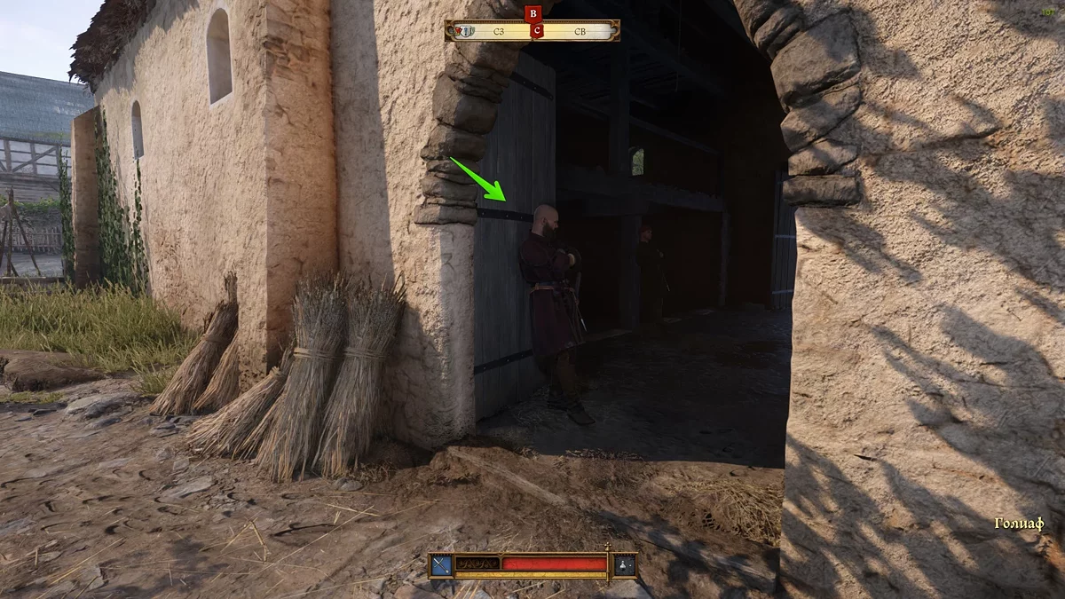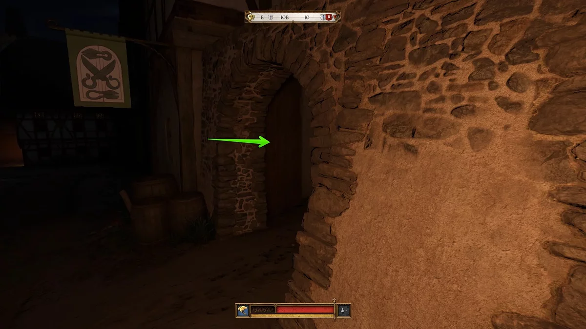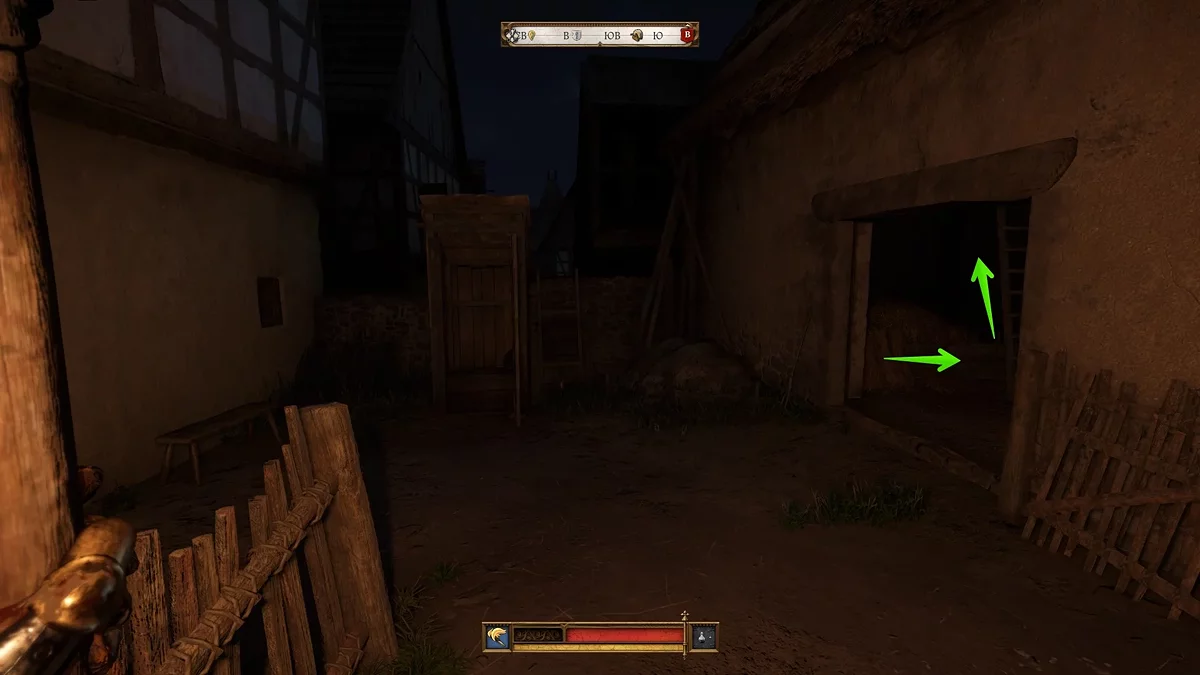 Відправляйтеся у східну частину поселення і доберіться до заднього входу у двір корчми. Тут буде невеликий амбар з кількома охоронцями — один сидить біля вогнища, інший патрулює територію. Вам навіть необов'язково розбиратися з ними, оскільки ви можете залізти по сходах у комору.