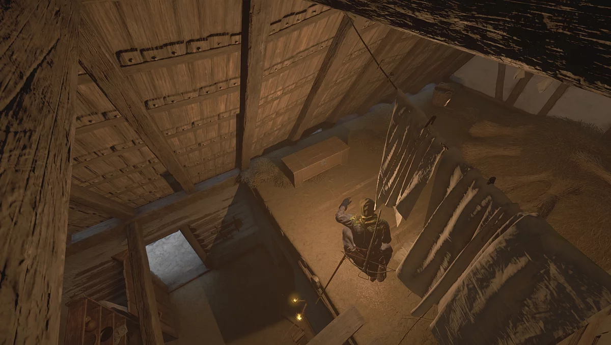 Підніміться на другий поверх, використовуючи сходи, які знайдете, якщо увійдете в дім через двері праворуч. Опинившись зверху, огляньте скриню, але, на жаль, нічого корисного в ній не лежить.