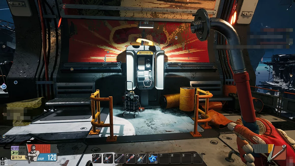 Увійдіть всередину і заберіть всі доступні ресурси, в тому числі і титан, який потрібен для ремонту туалету. Тут же ви знайдете предмет для колекції (25/48). Щоб вибратися назовні, візьміть в руки лом і бийте по кришці до тих пір, поки товариш не відкриє прохід.