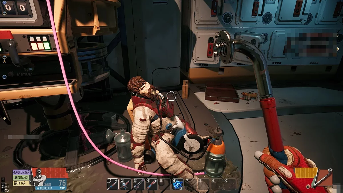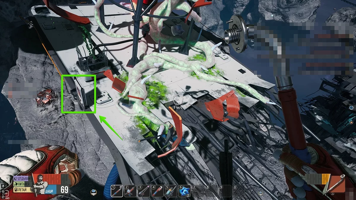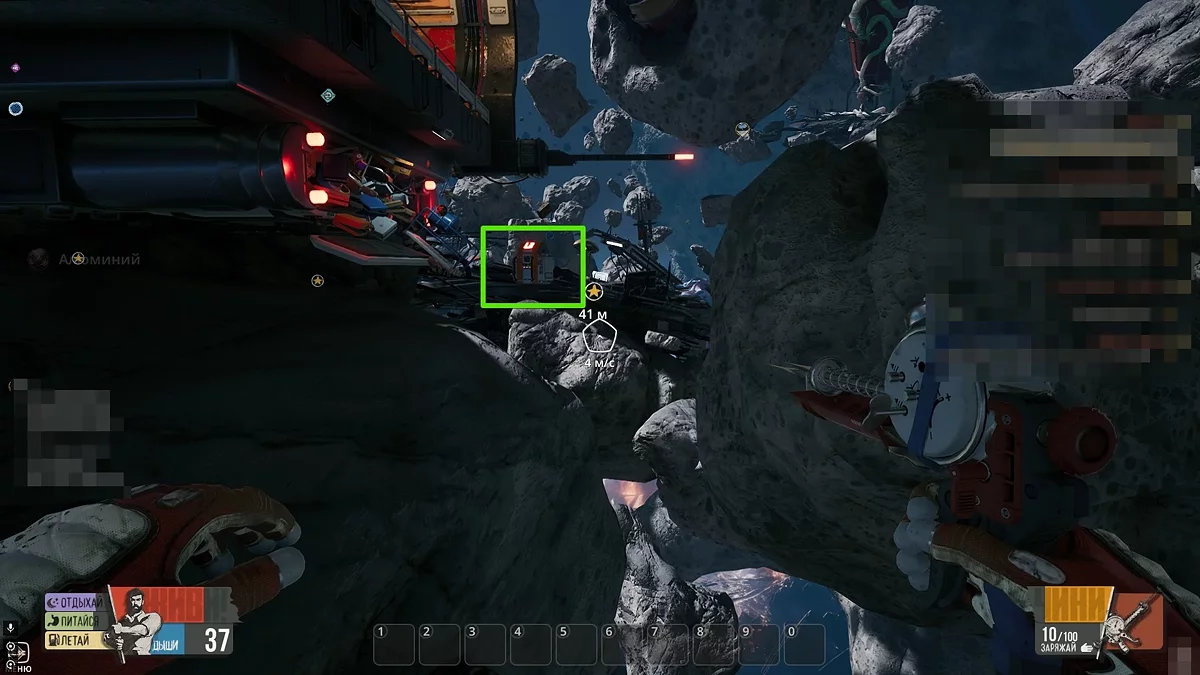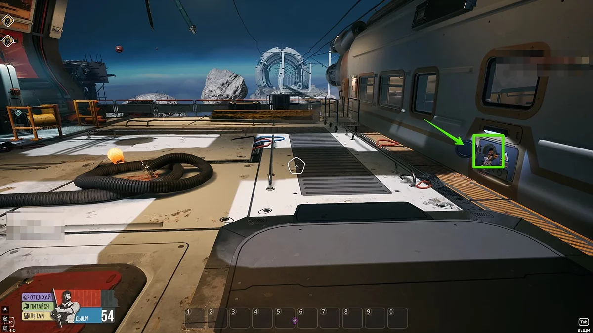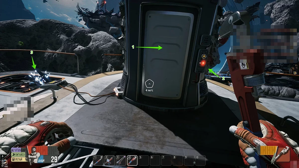 Оглянувши цей об'єкт, спершу зламайте металеві стержні на дверях, а потім вивчіть поломки зліва та справа від неї. Для ремонту щитка знадобиться 10 одиниць алюмінію, а для розриву з'єднання проводів потрібно знайти 15 одиниць титану. Останнє завдання трохи складніше, адже в відкритому космосі титану досить мало.