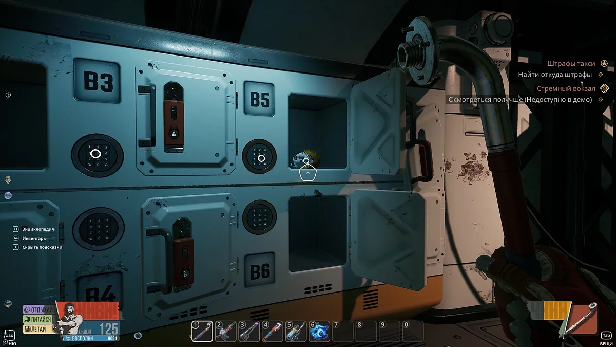Ще трохи правіше ви побачите ящики з кодовими замками — їх можна виявити при знаходженні різних предметів. Наприклад, якщо ви слідували гіду, прямо зараз можете відкрити ящики A6 і B5, і забрати кілька одиниць ізоленти та голову наглядача (26/48). Останній предмет не тільки вважається колекційним, але й знадобиться для отримання досягнення «Наглядач». Для цього поверніться на платформу до Дитяти, відшукайте тулуб і руку наглядача (зазвичай вони знаходяться зліва від постамента), потім вставте всі предмети.