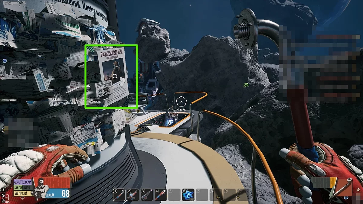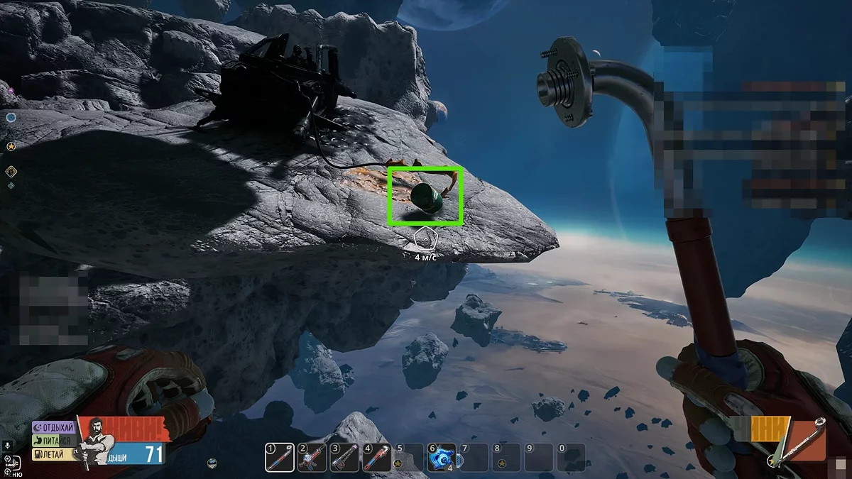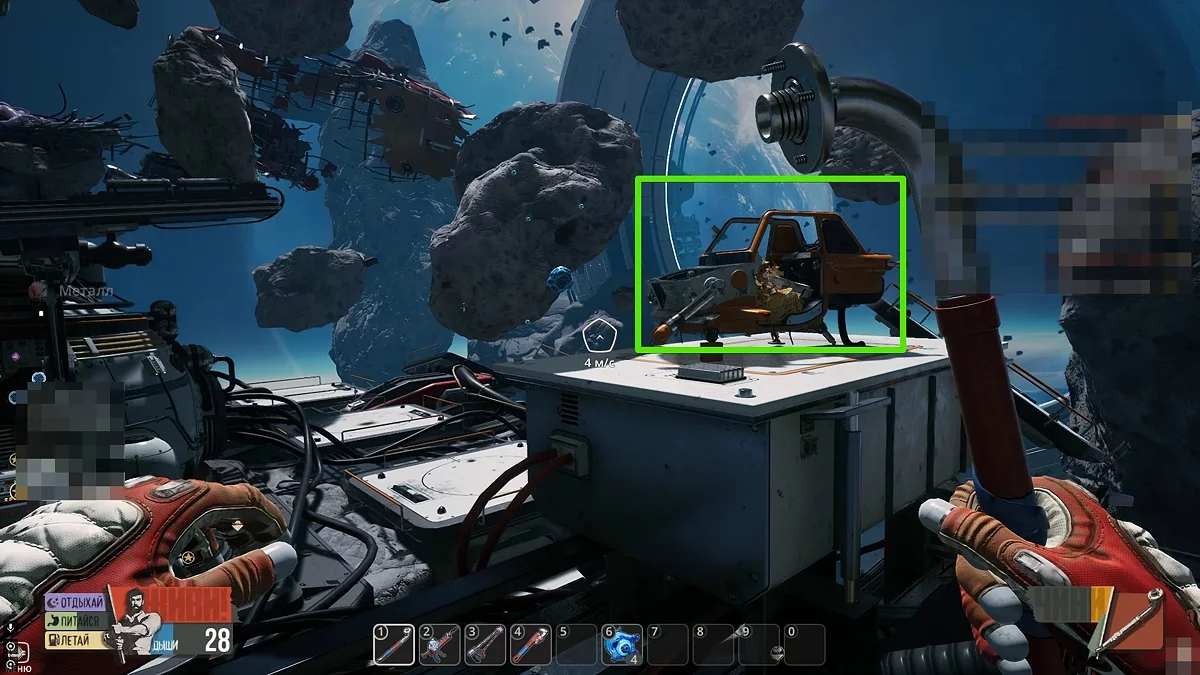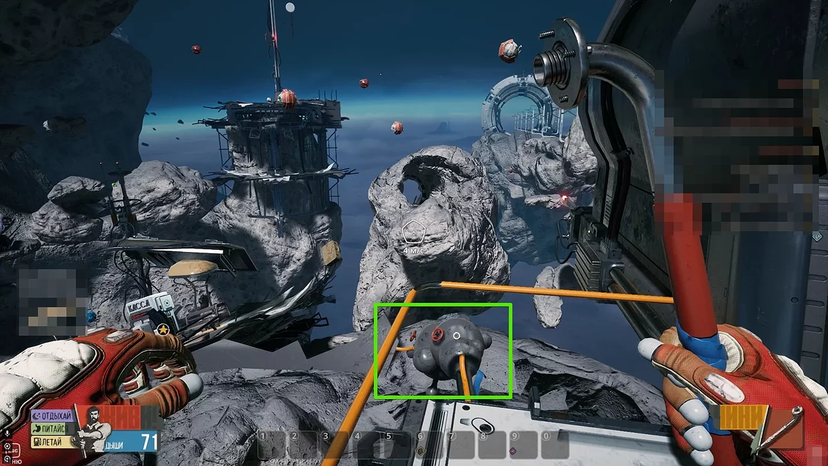 Виходьте в відкритий космос і огляньтеся. Шукайте невеликі уламки оранжевого кольору. Коли зберете їх, скрафтіть лом в інвентарі на окремій вкладці. За допомогою цього предмета ви зможете добувати метал та інші прості ресурси в необмеженій кількості. Окрім цього, не забудьте повернутися до Скафу і зірвати замок з телефонного апарата. Щоб отримати досягнення «Пранкер», ми прослухали автоответчик і вибрали останній варіант, натиснувши кнопку 3.