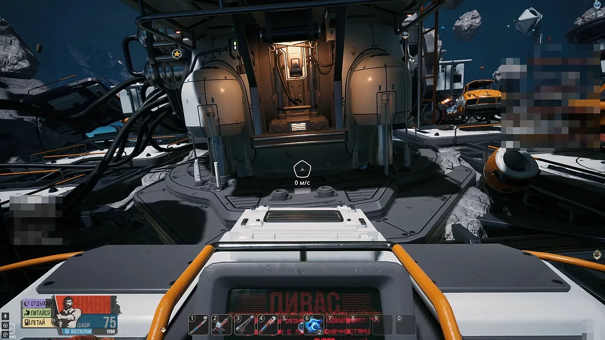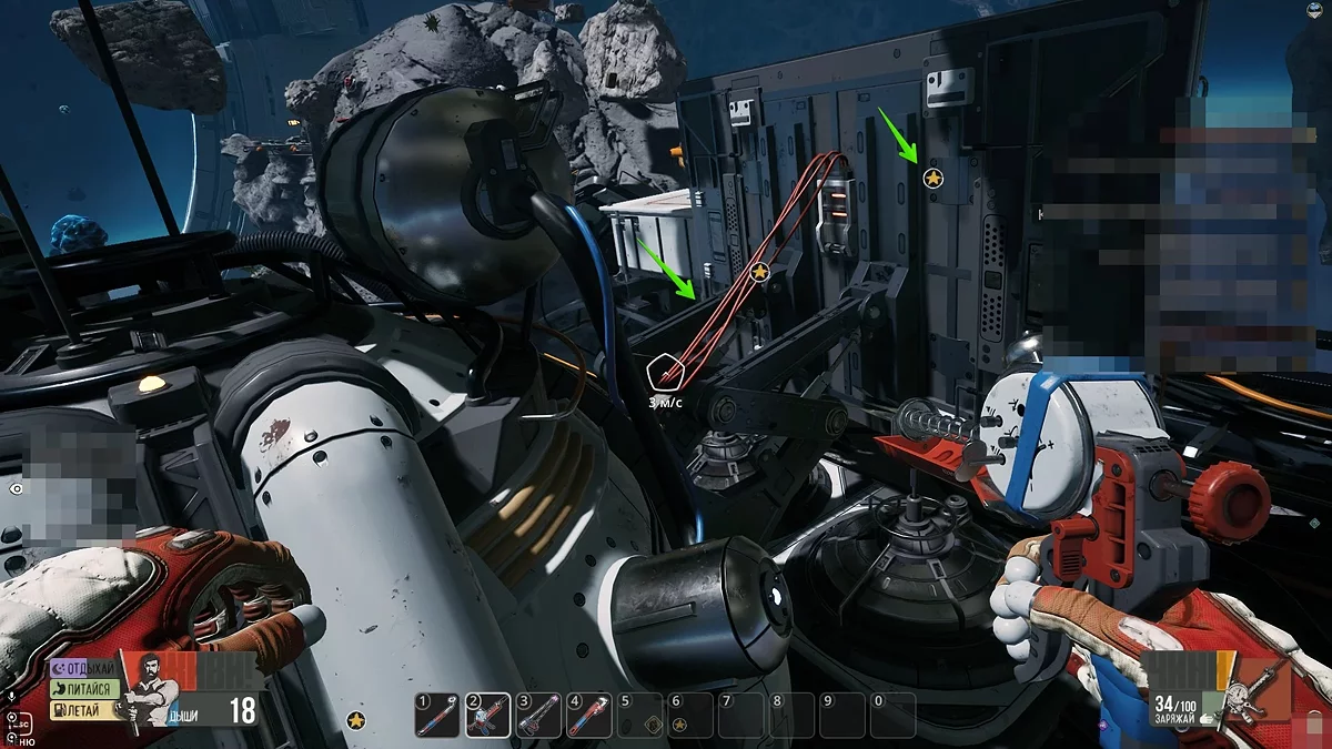 Вирушайте до астероїда з великими годинниками і гермодверима. Справа від дверей з'єднайте дві контактні пластини, щоб увійти всередину. Обшукайте труп зліва від входу в основний відсік, щоб отримати креслення зброї Брызготрон. Зберіть його в інвентарі — так буде простіше виконати наступне завдання.
