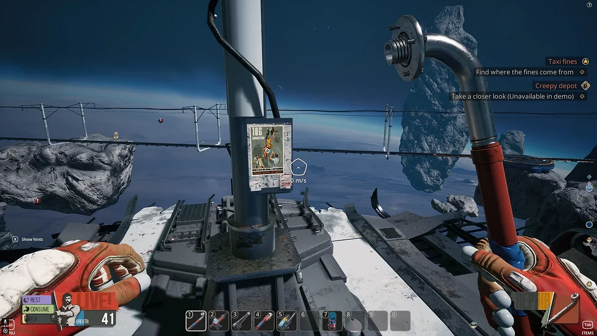 Після вступної кат-сцени огляньте вагон. Ваш герой повністю голий, тому знайдіть тут скафандр і шолом — обов'язкові елементи безпечного перебування в космосі. Також ви можете знаходити різні предмети, такі як постери, листи та інші речі. На столі лежить лист з адресою Мері (1/48) і телек (2/48).