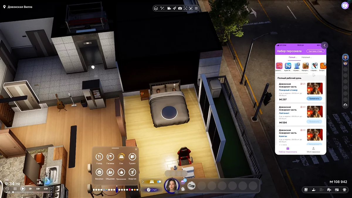 У верхній частині екрану розташовані значки підприємств, куди можна влаштуватися на роботу. Незалежно від вашого вибору, вам доведеться починати з найнижчої посади. Якщо ви мрієте, щоб ваш Zoi став головним пожежним, його шлях починається з позиції стажера пожежної служби.