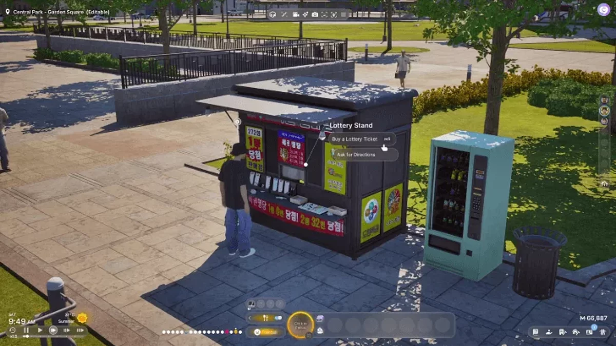 В inZOI ви можете випробувати удачу і взяти участь у лотереї. Старайтеся це робити завжди, коли гуляєте містом або йдете на роботу. Щоб купити квиток, ви повинні знайти фіолетовий кіоск з вивісками. Наприклад, один можна знайти в парку на центральній площі «Довона». Також лотерейні кіоски стоять у торгових центрах. Підійдіть до кіоску і клікніть на нього. Виберіть опцію «Купити лотерейний квиток» (5 «Мяу» за штуку).