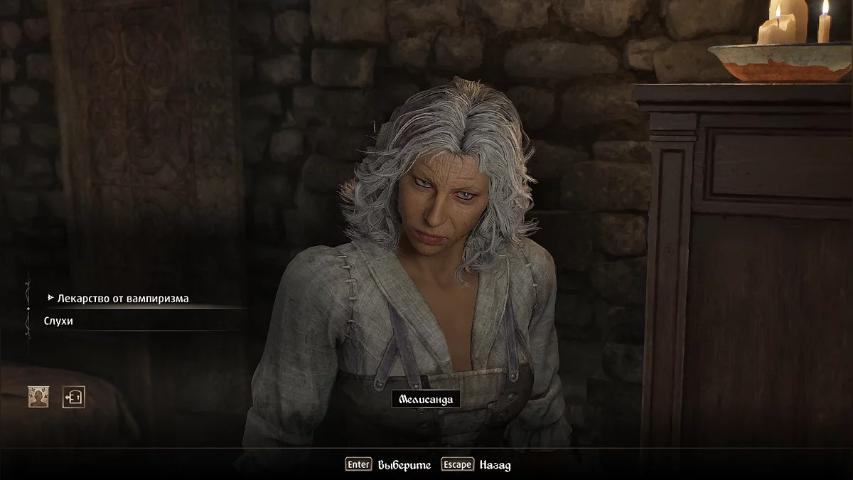 Маг порекомендує знайти графа Януса Гассилдора (Janus Hassildor) в Скінгреді (Skingrad), у якого ми дізнаємось, що він також шукає ліки від вампіризму. Дворянин відправить героя на пошуки Мелісанди (Melisande) в Дрейклоу (Drakelowe).