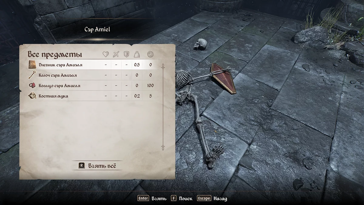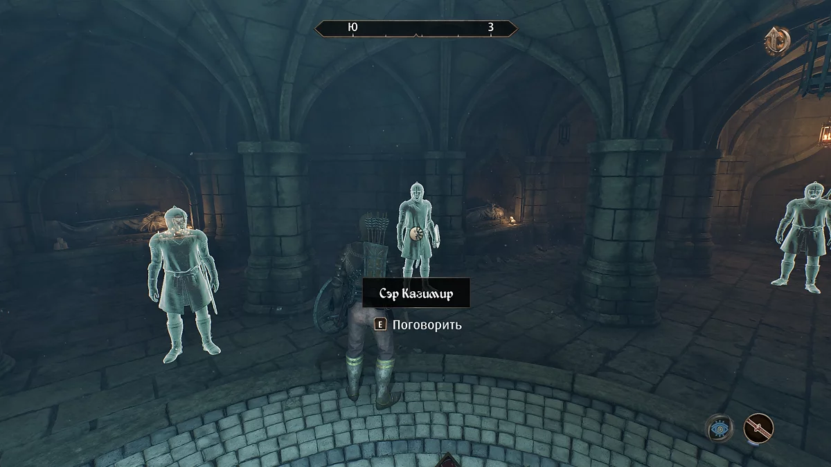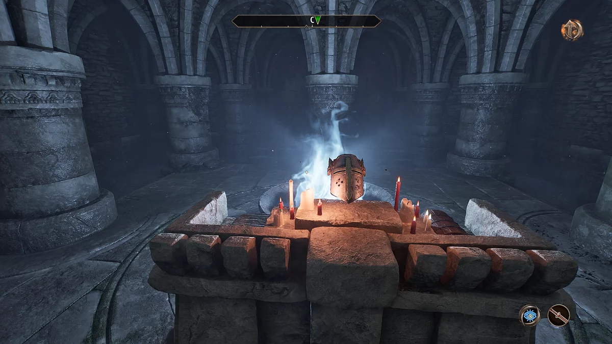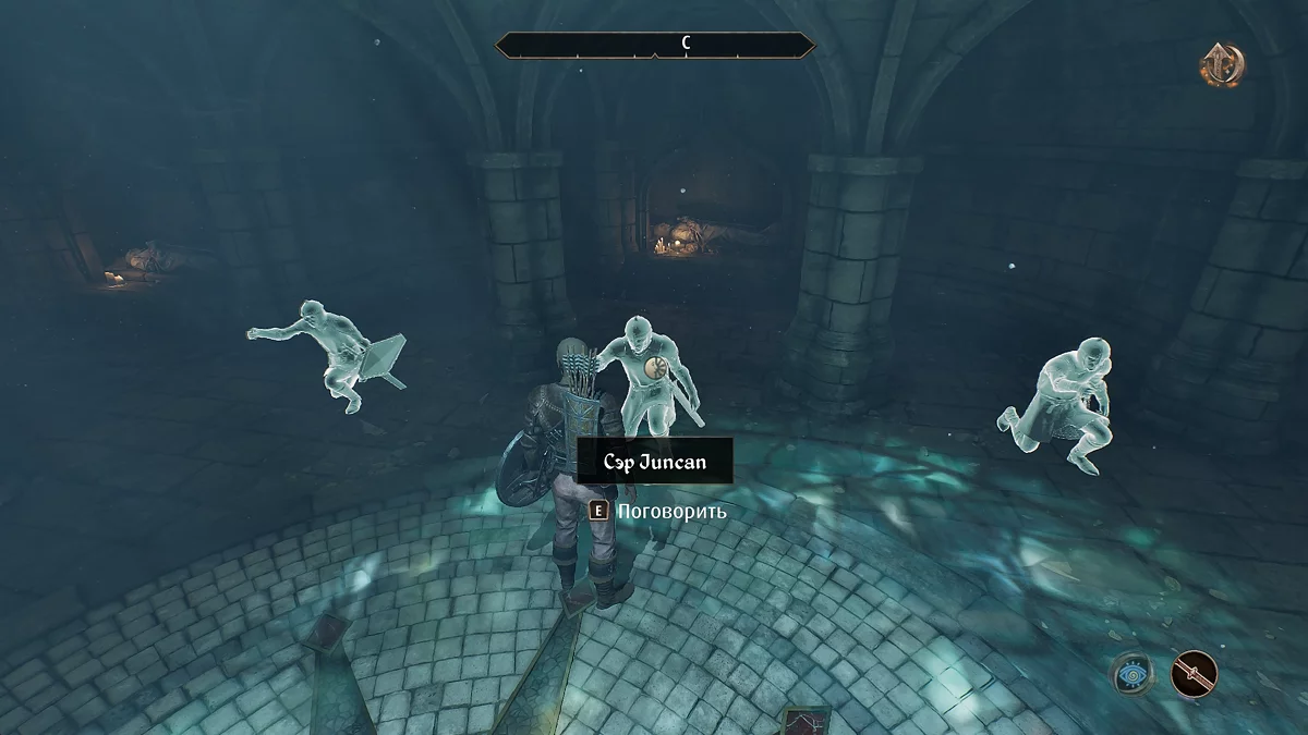 Знайдіть у руїнах скелет сера Аміеля (Sir Amiel Lannus) і заберіть усе, що є, з його останків. Відкрийте ключем калитку попереду і заберіться в тунель через тріщину в стіні. Потім пройдіть через катакомби, щоб потрапити до святині крестоносця. Заберіть з п'єдесталу шолом крестоносця (Helm of the Crusader), потім стрибайте вниз до скелета, відкрийте ворота і залиште руїни.