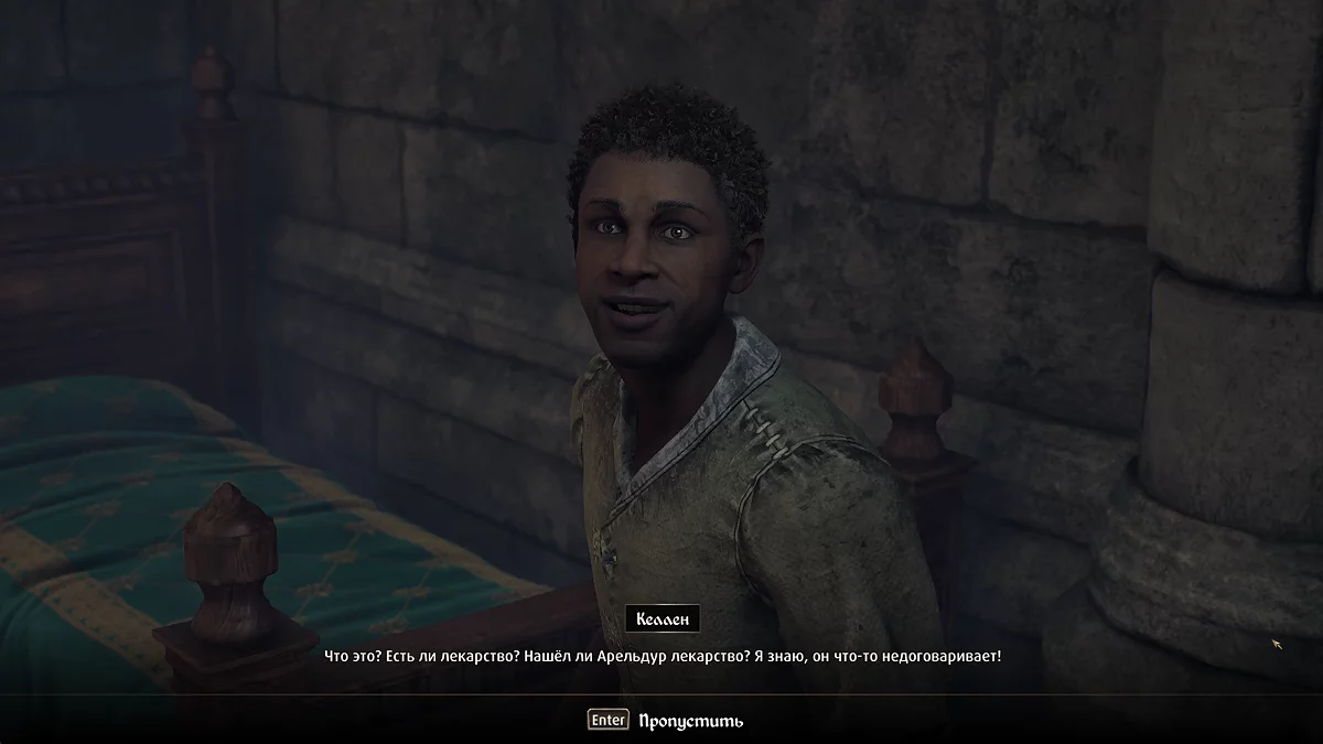 Поговоріть з настоятелем Арелдуром (Areldur), потім спустіться в холл і знайдіть Келлена (Kellen). Хлопець розповість, що страждає від прокляття вічної втоми, і попросить про допомогу. Поверніться до священика і запитайте, як можна допомогти редгару. Потім підійдіть до вівтаря і отримайте заклинання накладення рук (Lay Hands).