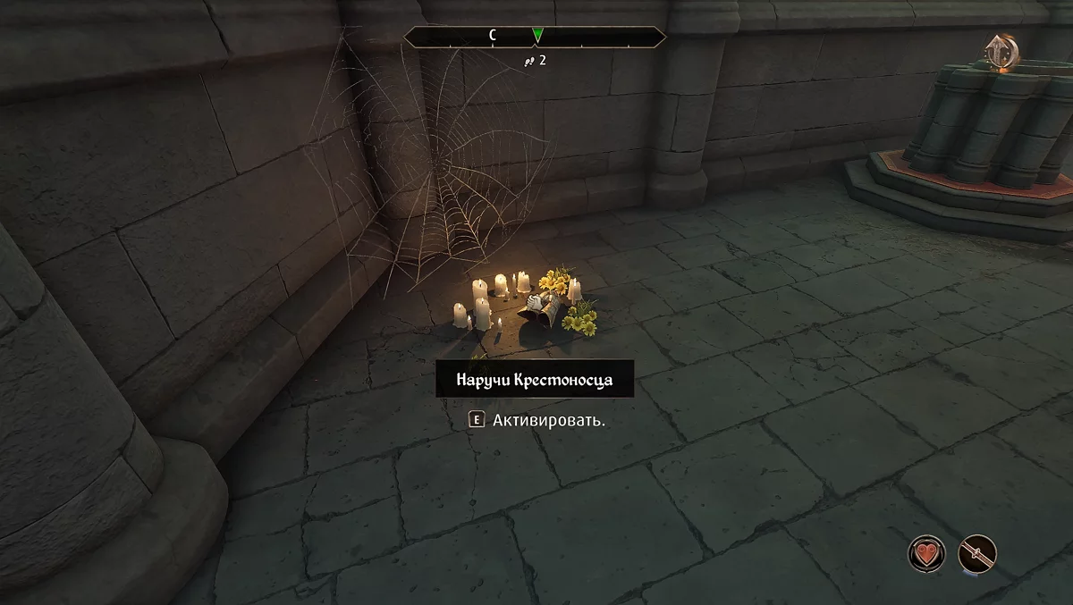 Зайдіть до храму і спустіться вниз у крипту. Перебийте всіх примар і взаємодійте з саркофагом святого Каладаса. Потім ви опинитеся в руїнах, де на величезній колоні в центрі лежить булава. Екіпируйте черевики крестоносця, пройдіть над прірвою по ледь помітній стежці. Заберіть булаву крестоносця (Mace of the Crusader).