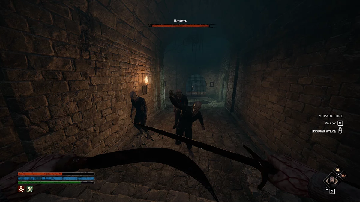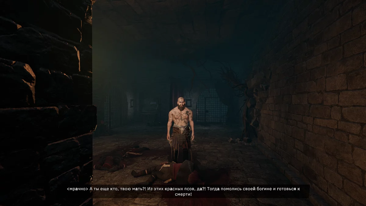 Візьміть з тіла наглядача «В'язничний ключ», яким ви відкриєте більшість камер. Тепер йдіть по сліду рятівника. Побачивши мертвого охоронця на стільці, потрібно повернути наліво, проте ви можете піти направо і випробувати себе в першому бою. Противник буде озброєний кинджалом. Бойова система в грі досить проста: блокуйте атаки або ухиляйтеся і атакуйте, поки противник готується до наступного удару.