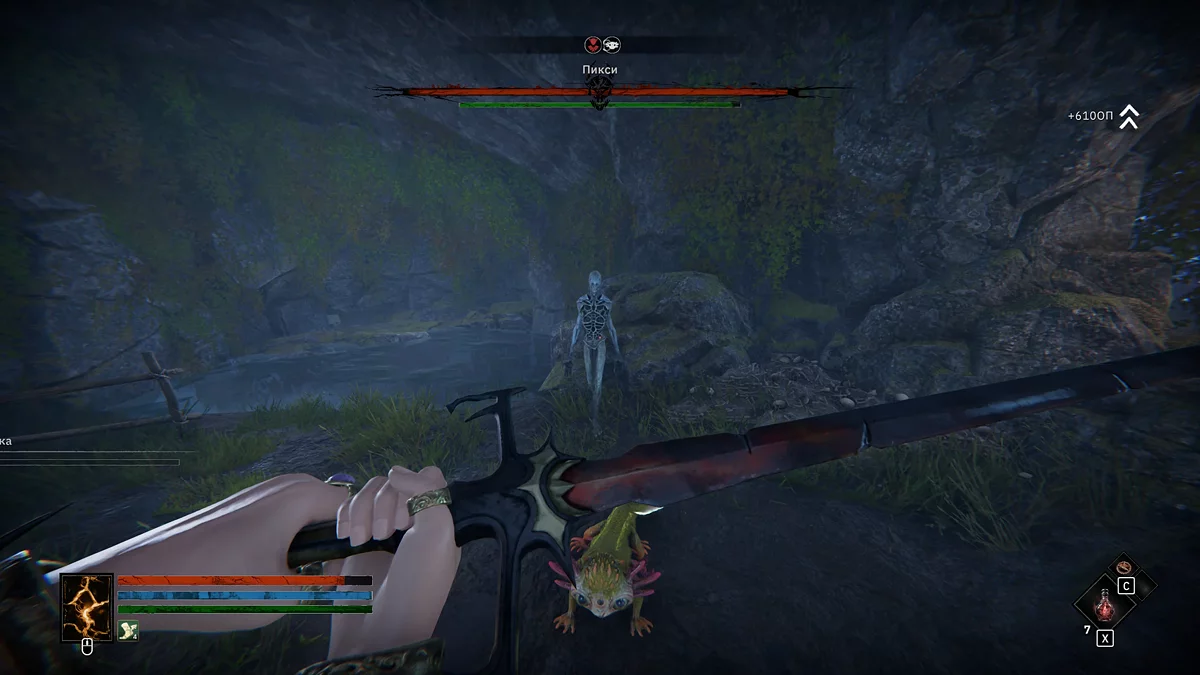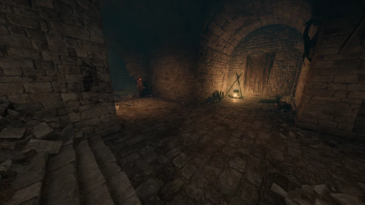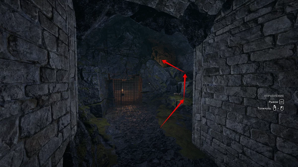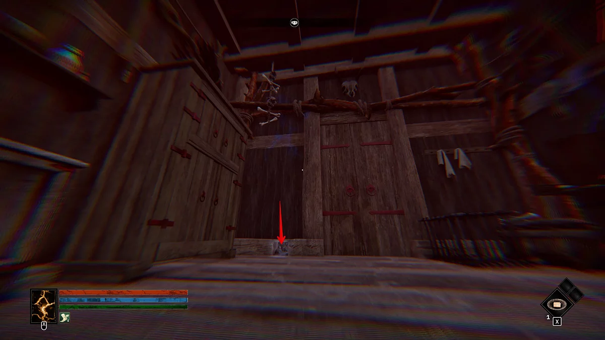 Якщо розбити камені в проході праворуч від кирки, відкриється шлях до катівні, де можна знайти безліч цінних ресурсів. На вівтарі біля чаші візьміть заклинання «Переливання крові». Кровотеча – протягом часу відбирає у цілі певну кількість ОЗ.