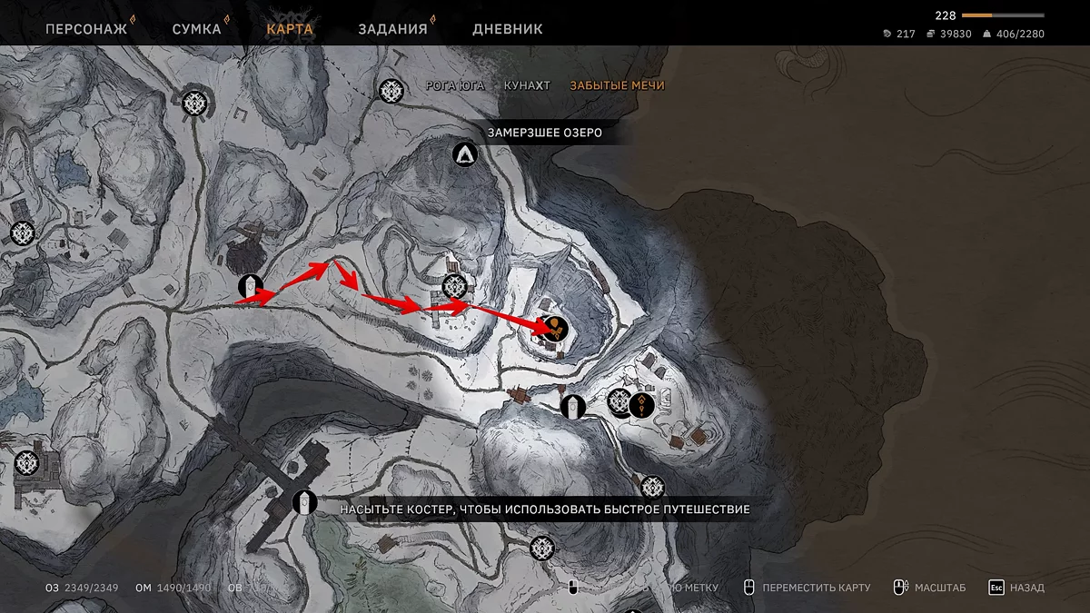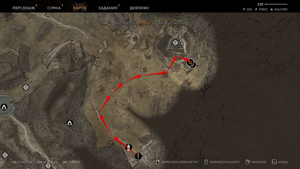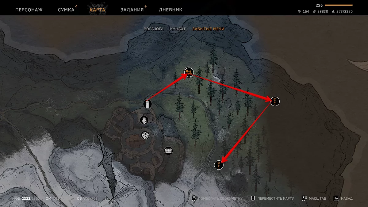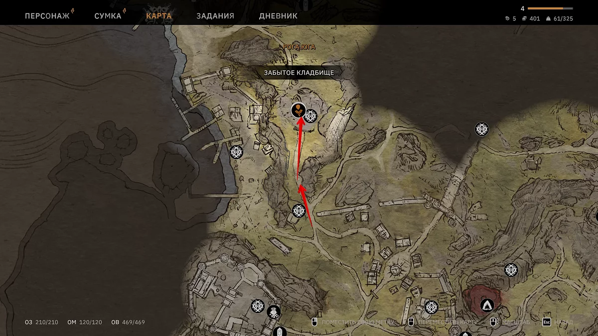 Від табору мисливця рухайтеся дорогою на північ, на роздоріжжі поверніть наліво. Зачищати «забуте кладовище» від скелетів не обов'язково, можна просто пробігти повз, не вступаючи в бій, це ніяк не вплине на квест.