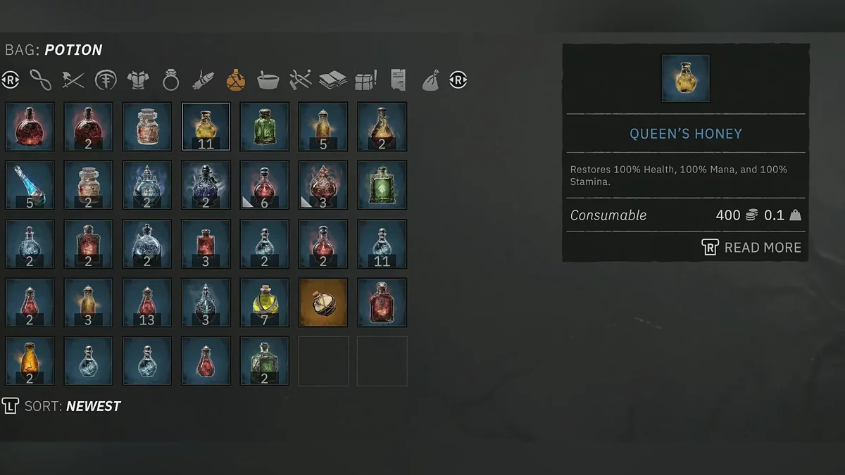 Щоб пережити виснаження здоров'я, вам знадобиться «Мед королеви» (Queen's Honey), надзвичайно потужне лікувальне зілля, яке швидко і повністю відновлює ваше здоров'я за одне використання. Цей предмет є нагородою за підтримку бджіл під час квестової лінії «Протистояння виглядає як надія».