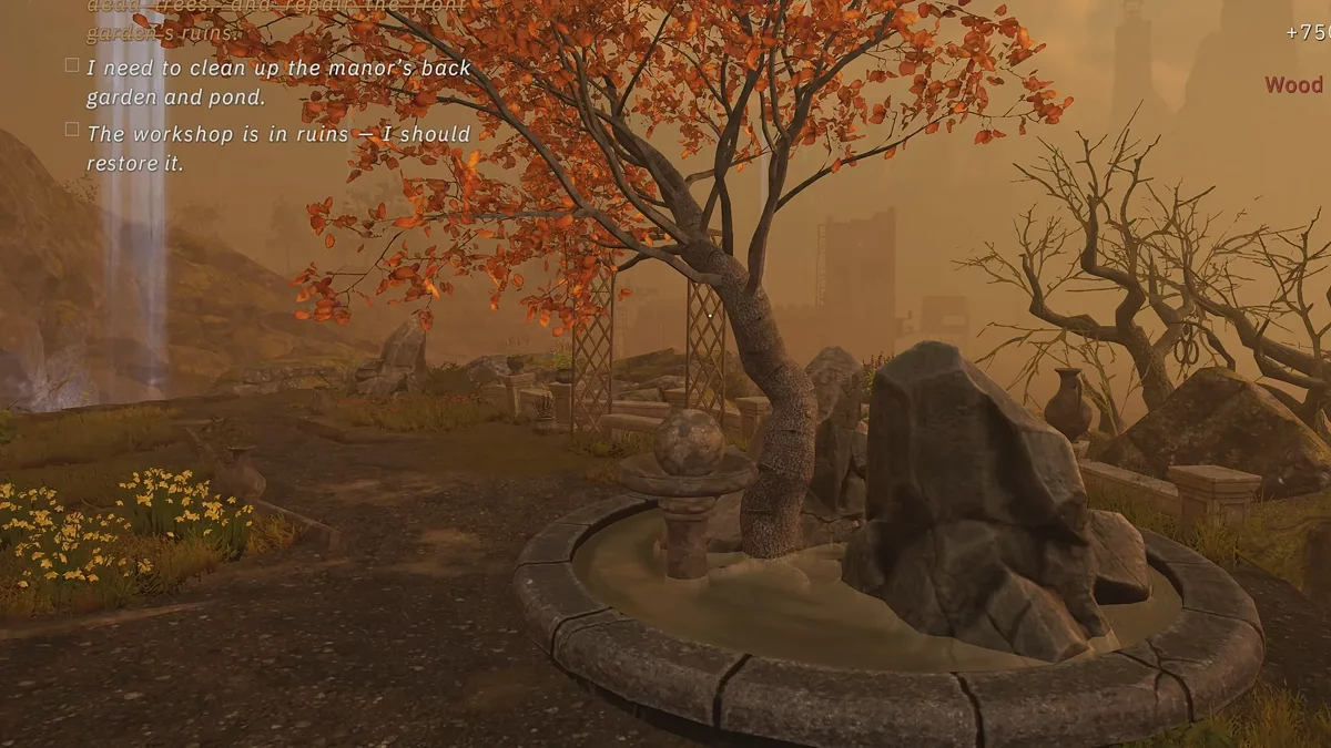 - Зберіть п’ять одиниць деревини і вирушайте в задню частину маєтку. Там є зона, де знаходиться ставок. Відремонтуйте його.
