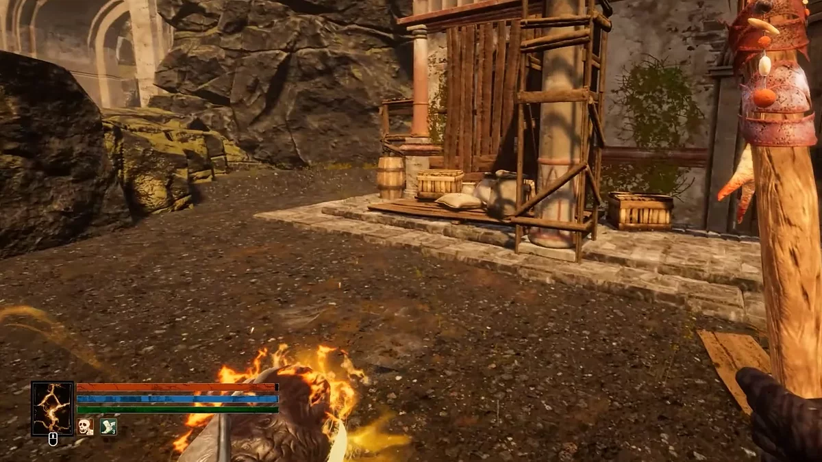 - Підійдіть до великого каменя, який знаходиться поруч з зображенням на стіні, і взаємодійте з ним.