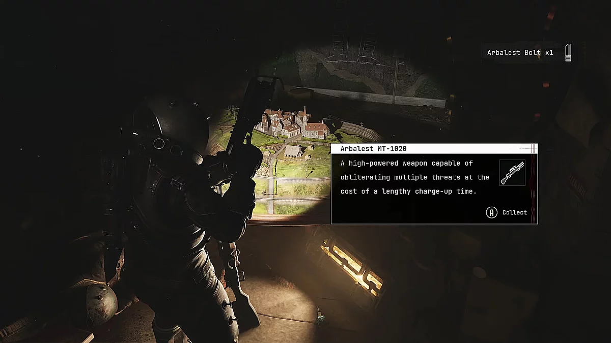 Область, в якій знаходиться Арбалет MT-1020, стане доступною для відвідування після перемоги над босом у Госпіталі (Hospital). Повернувшись у хаб, вам доручать відправитися в Абатство (Abbey) на поїзді. Не поспішайте з відправкою, спочатку потрібно відвідати локацію, де лежить пушка.