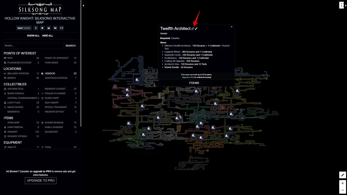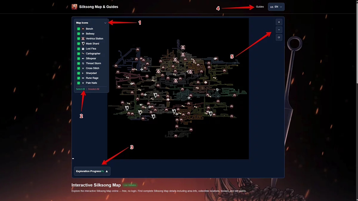 Значки на цій карті зручно відсортовані за категоріями, завдяки чому її можна назвати однією з найкращих. Крім того, на ній позначені майже всі об'єкти в грі: покращення, персонажі, вороги, торговці, витратні матеріали, інструменти, місця та багато іншого. Ще одна перевага — наявність скріншотів і детальних описів для багатьох елементів.