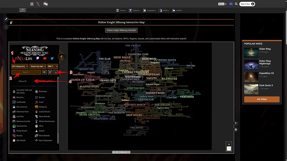 Карта має розширений функціонал щодо категорій, завдяки чому можна відсортувати предмети, покращення та місця. Зверніть увагу, що при наведенні курсора в нижній частині екрану відображаються координати, завдяки чому можна з точністю передавати інформацію про знаходження об'єктів.