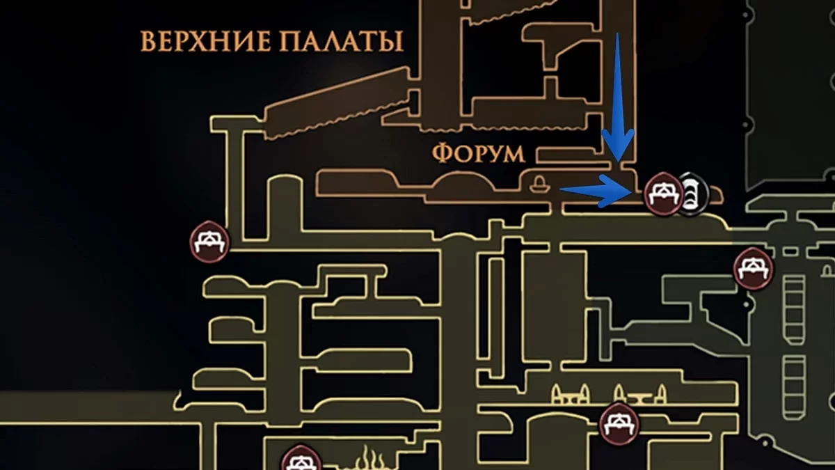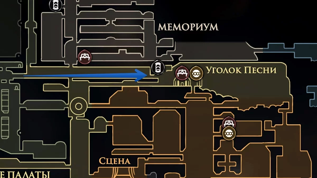 Від лавочки з душовою в локації Хорові палати йдемо наліво до арени битви з Послідовниками Хора (воїни в білому). Від цієї зони проходимо ще лівіше, поки не дійдемо до вікна, з якого стрибаємо в самий низ. Потім направо і знову вниз. Після падіння знаходимо станцію «Хорові палати».