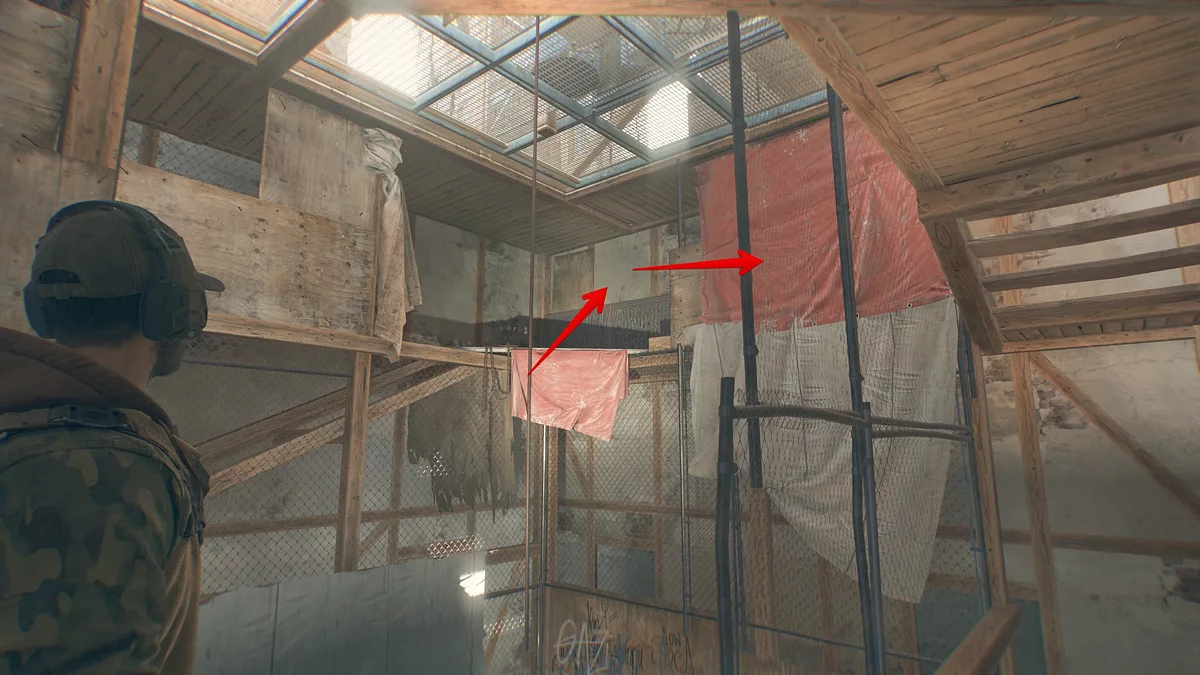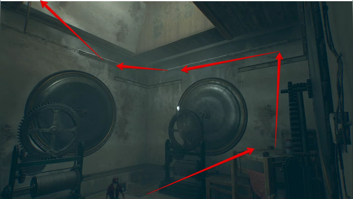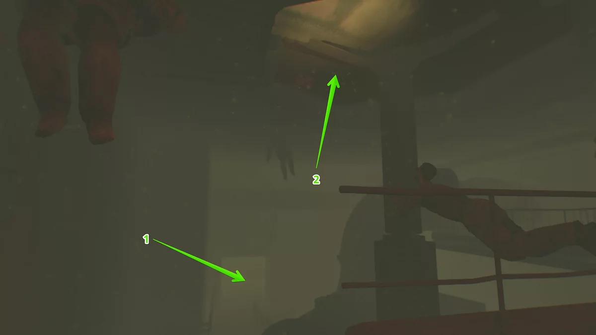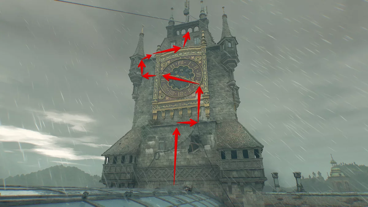 Увійдіть у дзвіницю. Знайдіть дві металеві балки і заберіться на них. За допомогою перекладини стрибайте на інший бік і повзіть вгору.