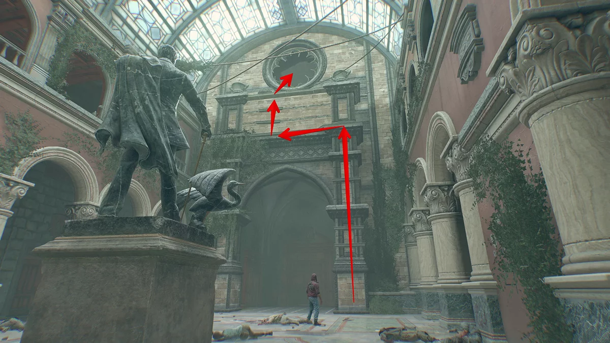 Заберіться по цеглі на постамент і через підніжжя статуї переберетеся на протилежний бік.