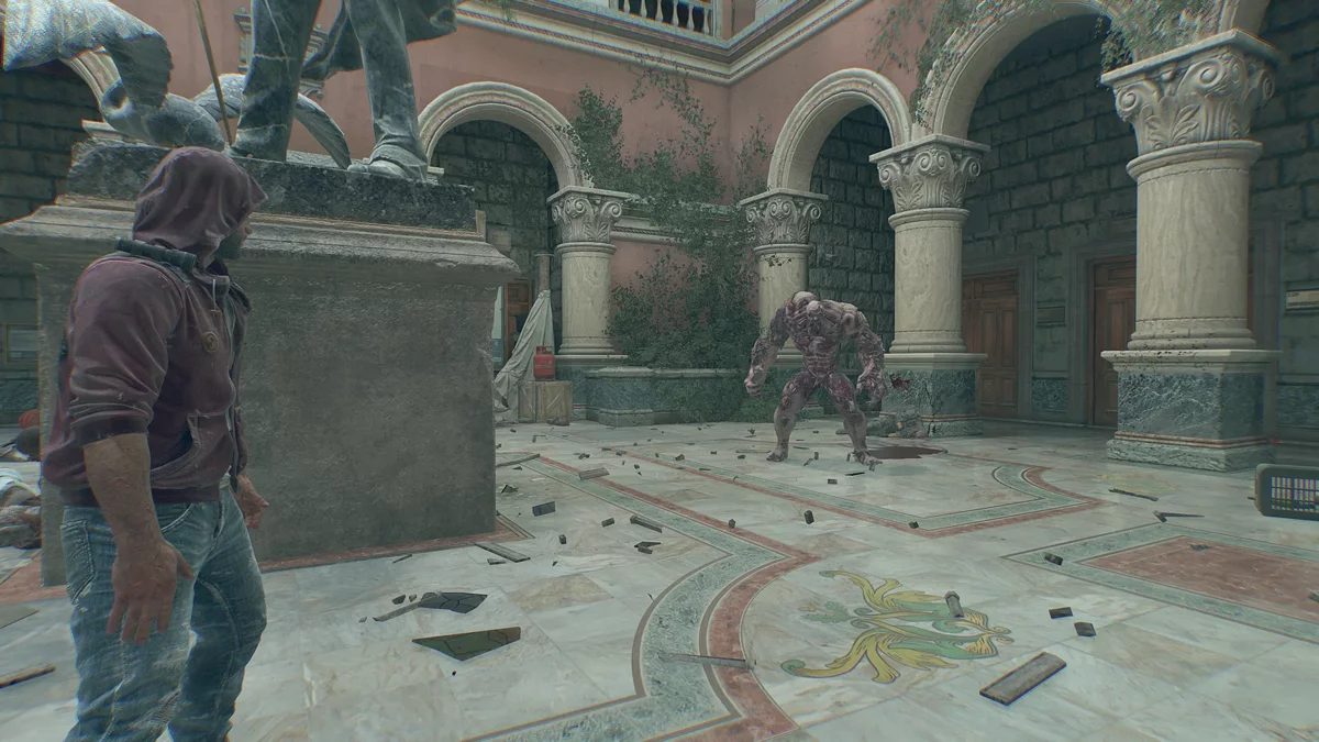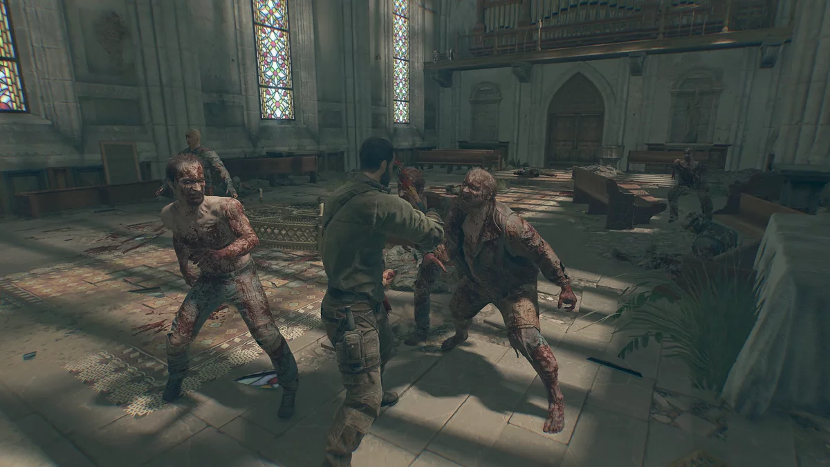 Як тільки опинитеся на території монастиря, на вас нападе заражений, розправтеся з ним. Підберіть біля статуї під куполом приманку, тому що попереду зустрінете скупчення інфікованих біля дверей. Кидайте бомбочки в кут зліва від дверей і біжіть направо.