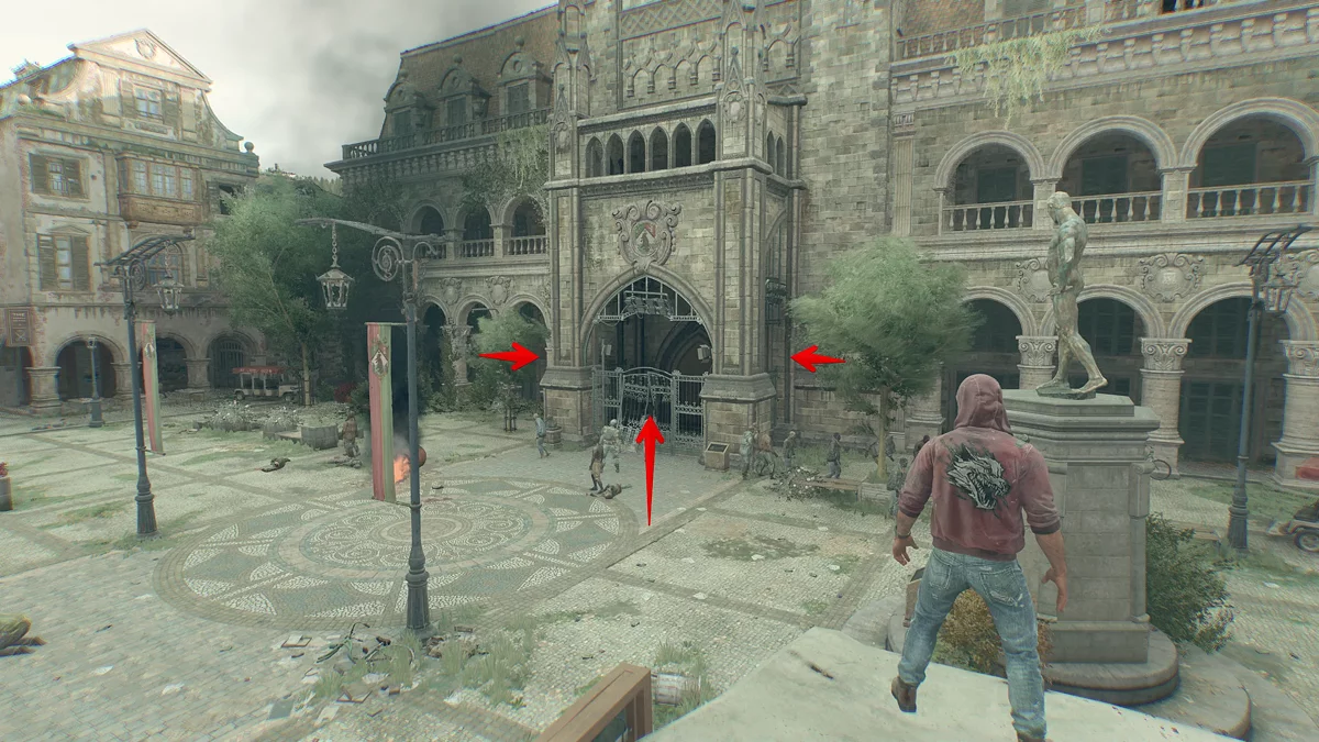 Користуйтеся тим, що звичайні заражені не вміють лазити по стінах, і переміщайтеся по місту за допомогою дахів. Однак врахуйте, що вони не пустують, тому іноді доведеться битися. Доберіться до ратуші і побачите, що вхід оточений. Відволікайте ворогів і залізьте з одного з трьох боків через огорожу і відкрийте двері.
