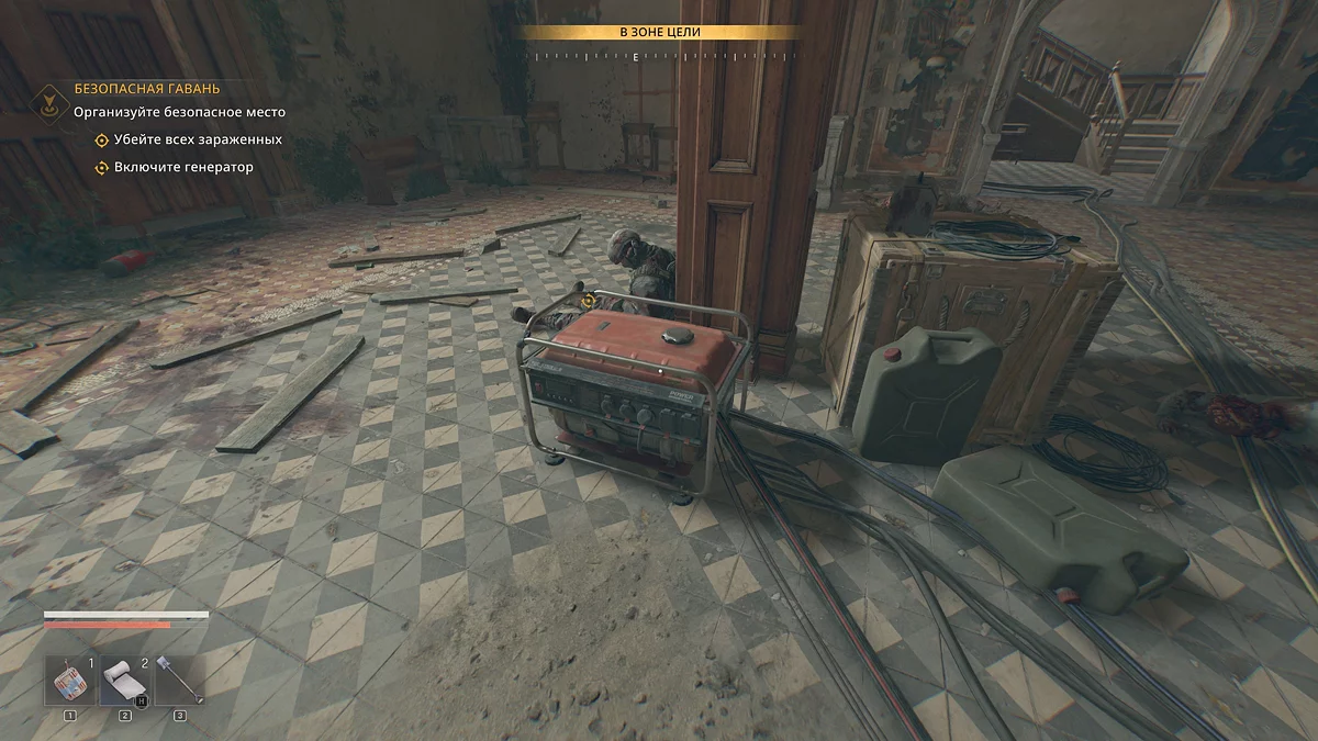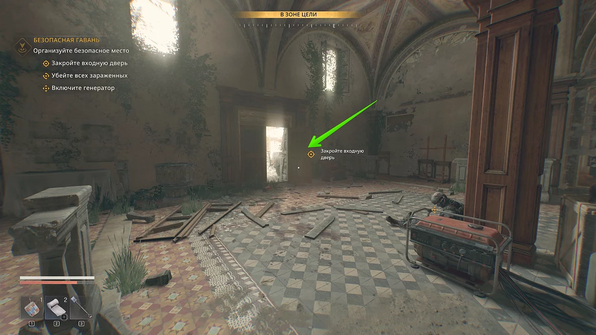 Забирайтеся на веранду, а потім проберіться у внутрішній двір і пролізьте під решіткою, щоб запустити генератор і забезпечити безпечну зону.