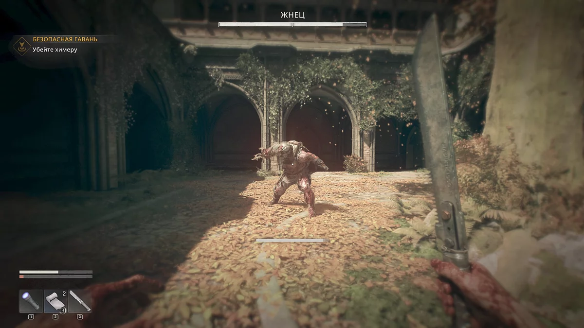 Відразу після катсцени почнеться перший боссфайт. На початку бою у вас буде мачете. У жнеця є дві фази. Далі ми детально розповімо про те, як поводитися в бою.