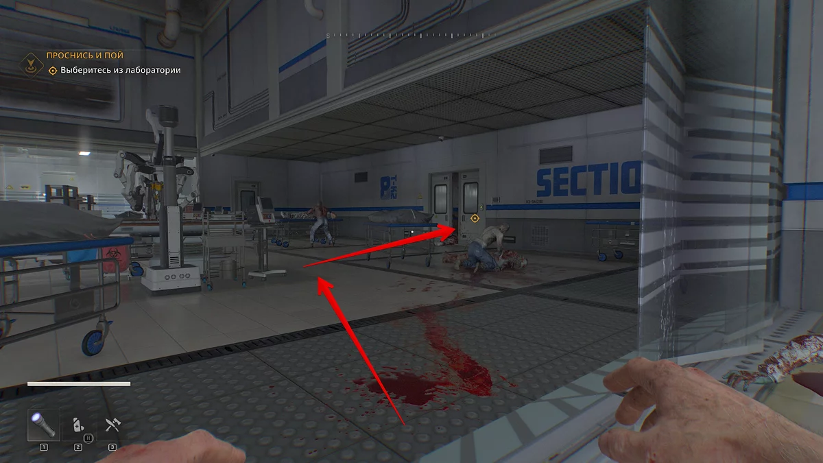 Тепер подивіться в бік виходу. У вас на шляху пара заражених, першого обійдіть зліва, а другого справа, таким чином ви покинете головну операційну непоміченим. Врахуйте, що якщо вас виявлять, нападуть бігуни, швидкі та небезпечні заражені, тому намагайтеся відступити в вентиляційну шахту.